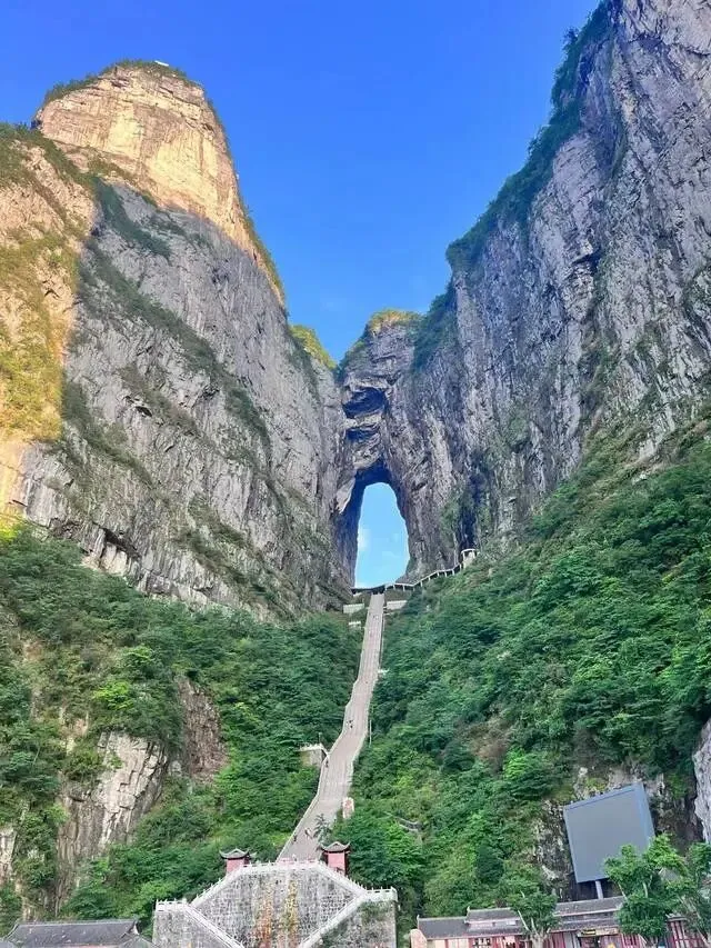 早餐后乘车赴张家界,游览【天门山国家森林公园】天门山文化底蕴深厚,有“武陵之魂”之称,更有湘西第一神山的美誉,它兼峰、石、泉、溪、云、林于一体,集雄、奇、秀、险、幽于一身,被誉为空中原始花园。我们乘坐天门山索道,前往游览天门山:观天门洞、99道弯公路奇观(通天大道)、李娜别墅、鬼谷栈道、鬼谷兵盘、云梦仙顶、天门山寺、灵泉院、木石之恋等著名景点。【天门索道】:索道线路斜长7455米,上、下站水平高差1279米,是世界最长的单线循环脱挂抱索器车厢式索道,犹如一道彩虹飞渡“人间” “天上”,又像一条巨龙腾翔素云苍穹,依山籍壁,拔地冲天,荡气回肠,恢宏壮观,成为天门山旅游风景区“四大奇观”之一。【通天大道】:被称为通天大道的盘山公路共计99弯,似玉带环绕,弯弯紧连,层层叠起,依山籍壁,直冲云霄,“天下第一公路奇观”横空出世,从索道上观看公路,有如蜘蛛网一般密集的公路,垂直高差达千米左右。【天门洞开】:九百九十九级台阶登上天门洞,登天祈福。高131.5米,宽50余米,南北对开于千寻素壁之上,气势磅礴,巍峨高绝,是罕见的高海拔穿山溶洞,更是尽显造化神奇的冠世奇观,2006俄罗斯空军张家界天门山特技飞行表演让天门洞悬念升级,再次成为全球焦点。【玻璃栈道】。