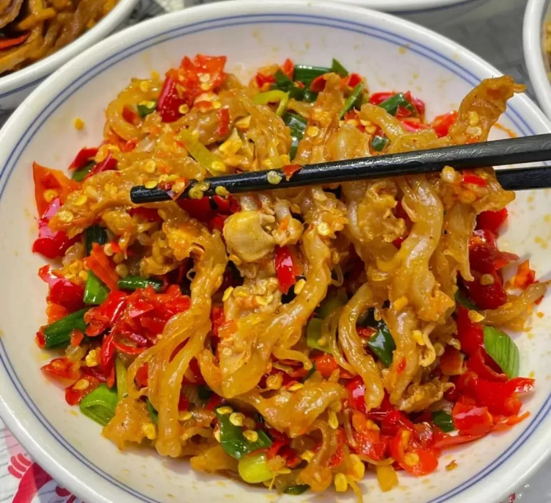 裹满辣椒籽的鸭掌筋一口入魂,鲜辣直冲天灵盖,后劲十足却不呛喉,辣得嘶哈也舍不得停筷,拌上米饭直接封神,妥妥的“米饭杀手No.1”,嗜辣星人直接狂喜!