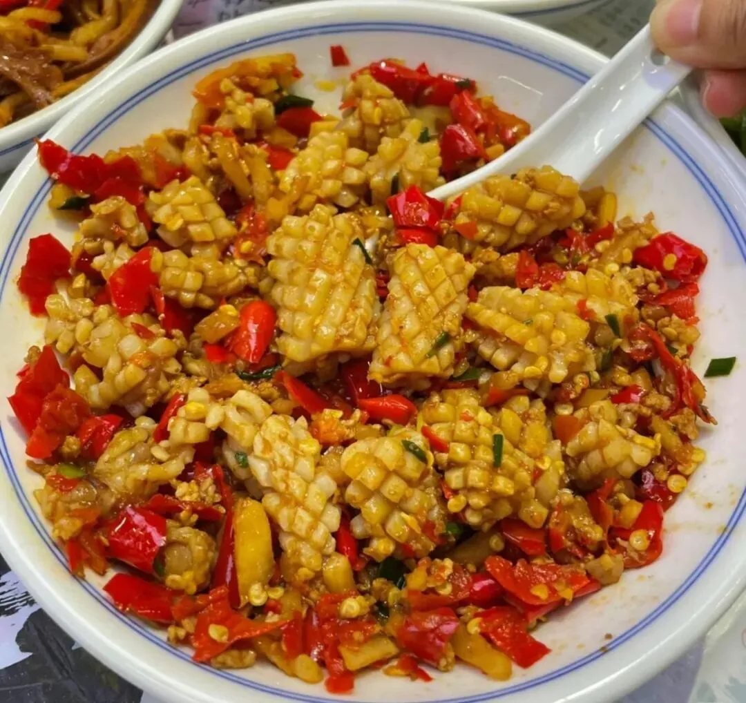 鲜鱿改卷猛火爆炒,裹满湘式酱汁,配辣椒大蒜叶锅气十足。入口Q弹脆嫩无腥,鲜辣开胃,拌米饭香到舔盘,辣度可调,来一盏灯别错过这口鲜!