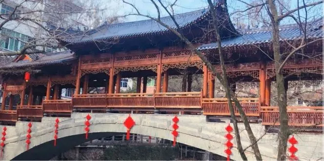 青街廊桥因跨青街溪而得名,处于睦源村与太申村水口。石拱桥始建于1973年,桥长39.8米,高11.5米,宽5.68米。桥身为单孔青石结构,由溪涧中开采的花岗岩块石和条石拱砌而成,桥为拱形,桥洞呈半椭圆形。2012年,乡贤唐升波创建抬梁式木结构廊屋九间,聘本地雷衍银等畲族木匠师傅承建。桥廊设计奇艺,造型优美,结构坚固。