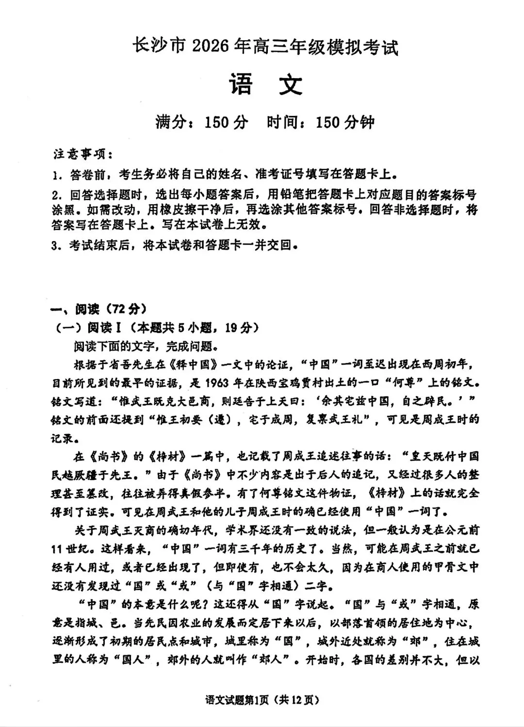 >长沙一模语文试卷长沙市2026年高三年级模拟考试语文