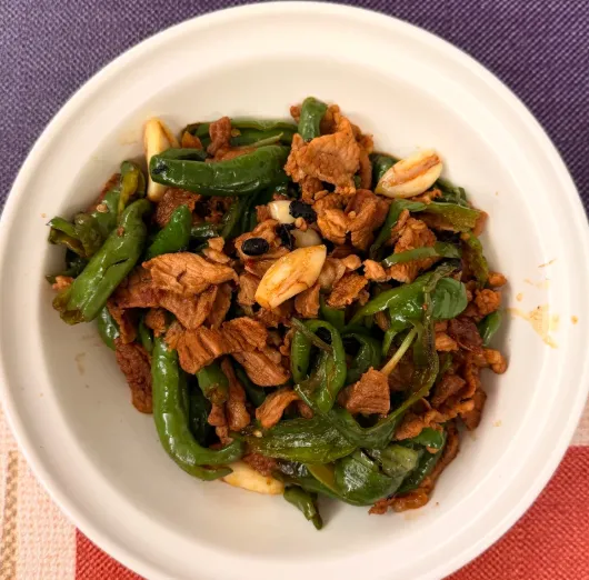 特色菜:辣椒炒肉这道菜看着简单,其实讲究。肥肉要切得薄,先下锅煸出油,那股猪油香是灵魂。本地的螺丝椒拍裂,在油里滚得起虎皮,吸饱了肉香。最后瘦肉下锅,大火猛炒,酱油一烹,镬气十足。汤汁千万别浪费,拌着白米饭吃,油润香辣,一口下去,人就醒了。