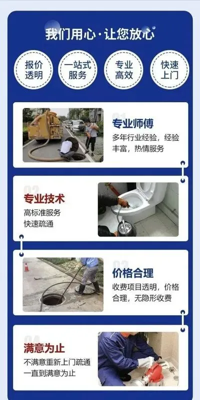 提供24小时同城上门疏通服务,包括下水道疏通、管道清洗、马桶疏通、地漏疏通、浴缸疏通、菜池疏通等。师傅经验丰富、上门迅速、价格透明,服务范围涵盖:疏通主管道、高压清洗管道、抽化粪池、维修水管、安装下水管道、清理隔油池等各类管道维修与清洁服务。