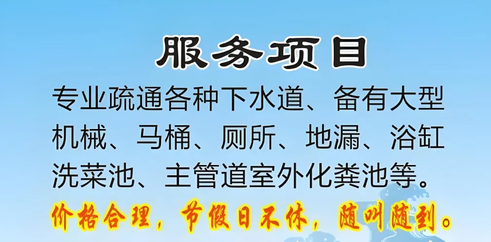下水道:家庭、酒店、饭店、店铺下水道,小便池、阴沟疏通。