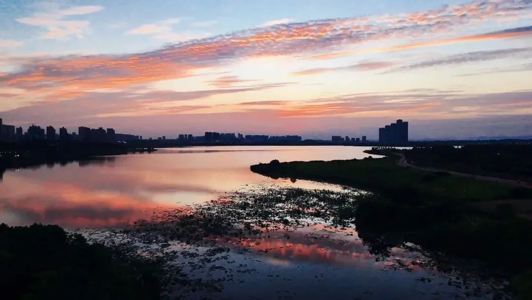 绕湖一圈,慢跑行,骑车也行,傍晚光线一压,天边红一片,拍照不用滤镜。