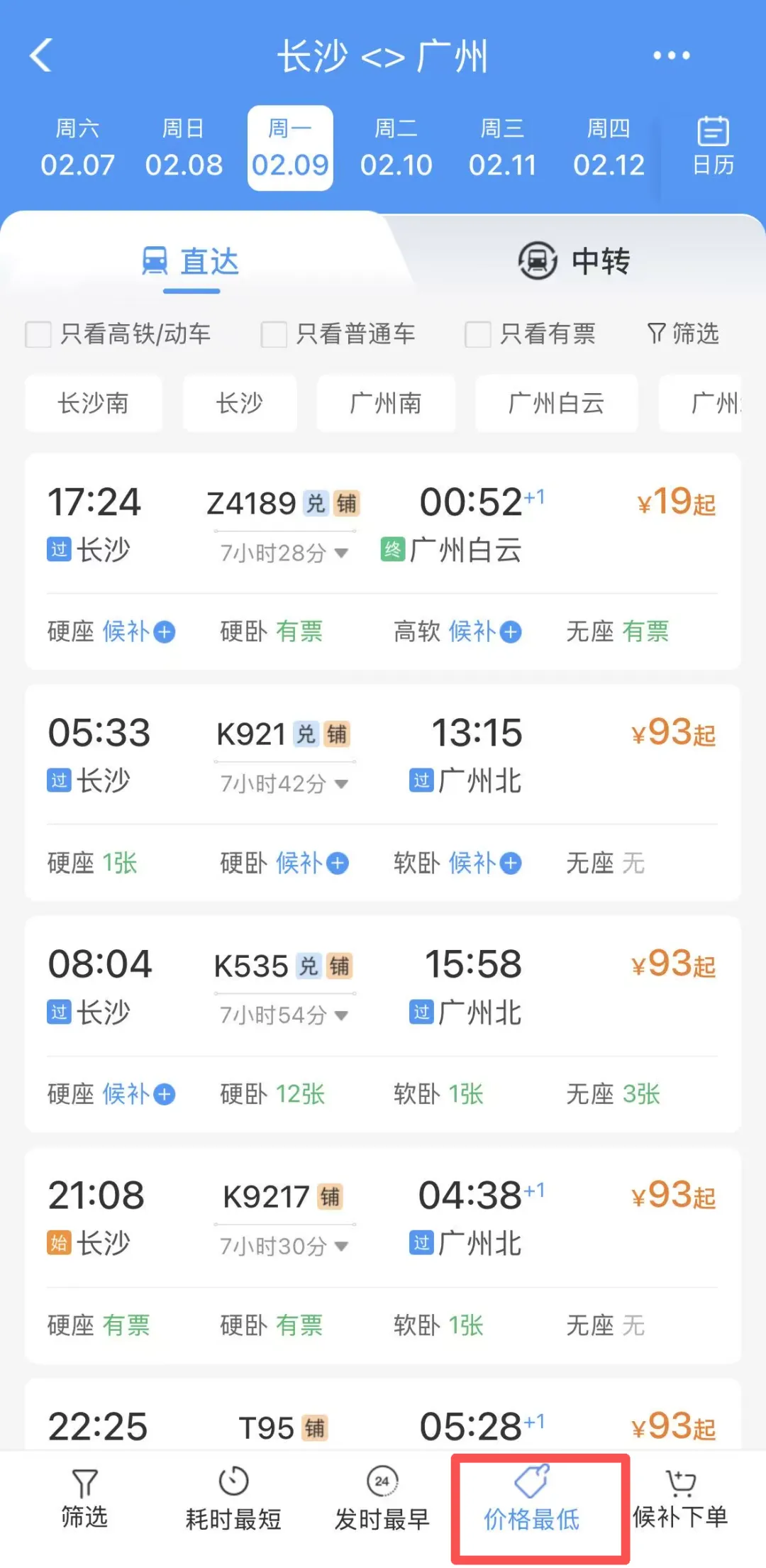2月7日—13日,长沙站至广州白云站的Z4189次列车,硬座票价折后仅19元;