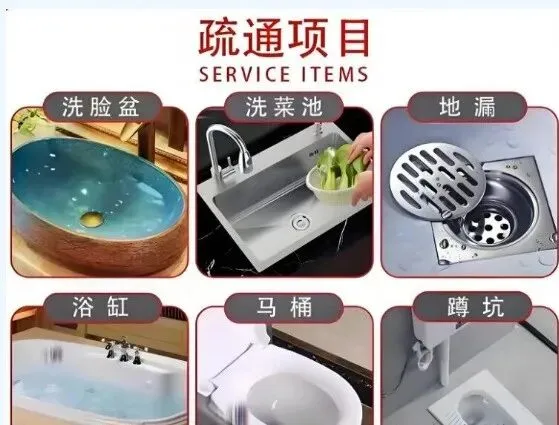 疏通类:各类下水道、马桶、蹲厕、地漏、脸盆、菜池、墩布池、主管道、工业管道等