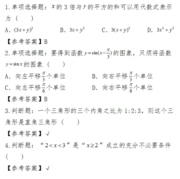 数学的考试命题范围包括:代数式、方程(组)、不等式(组)、集合与函数、三角函数与解三角形、数列、平面几何初步、立体几何初步、平面向量、直线和圆、概率和统计初步等。考试的数学基础知识是指本大纲所规定教学内容中的数学概念、性质、法则、公式、定理以及其中的数学思想方法。
