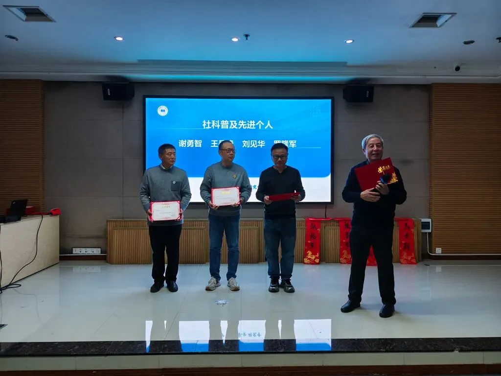 ▲柳肃会长为研究会2025年度社科普及先进个人颁奖(左起):罗隆军、王岳峰、谢勇智、柳肃。
