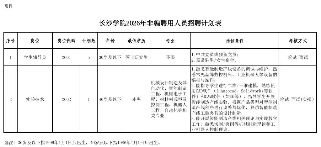6.岗位所需要的其他条件见《长沙学院2026年非编聘用工作人员招聘计划表》(附件)。