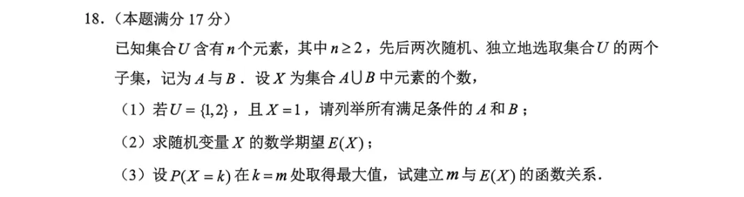 第(2)问,对思维能力的要求瞬间拔高.我们可以先分析,对于全集U中的任意元素,属于全集U子集的概率为1/2.则可以知道任意元素属于A的概率为1/2,属于B的概率也为1/2,故属于AUB的概率为:1-1/4=3/4.即任意一个元素属于AUB的概率都是3/4.由此可知X的分布为二项分布,即X~B(n,3/4),故E(x)=n*3/4.