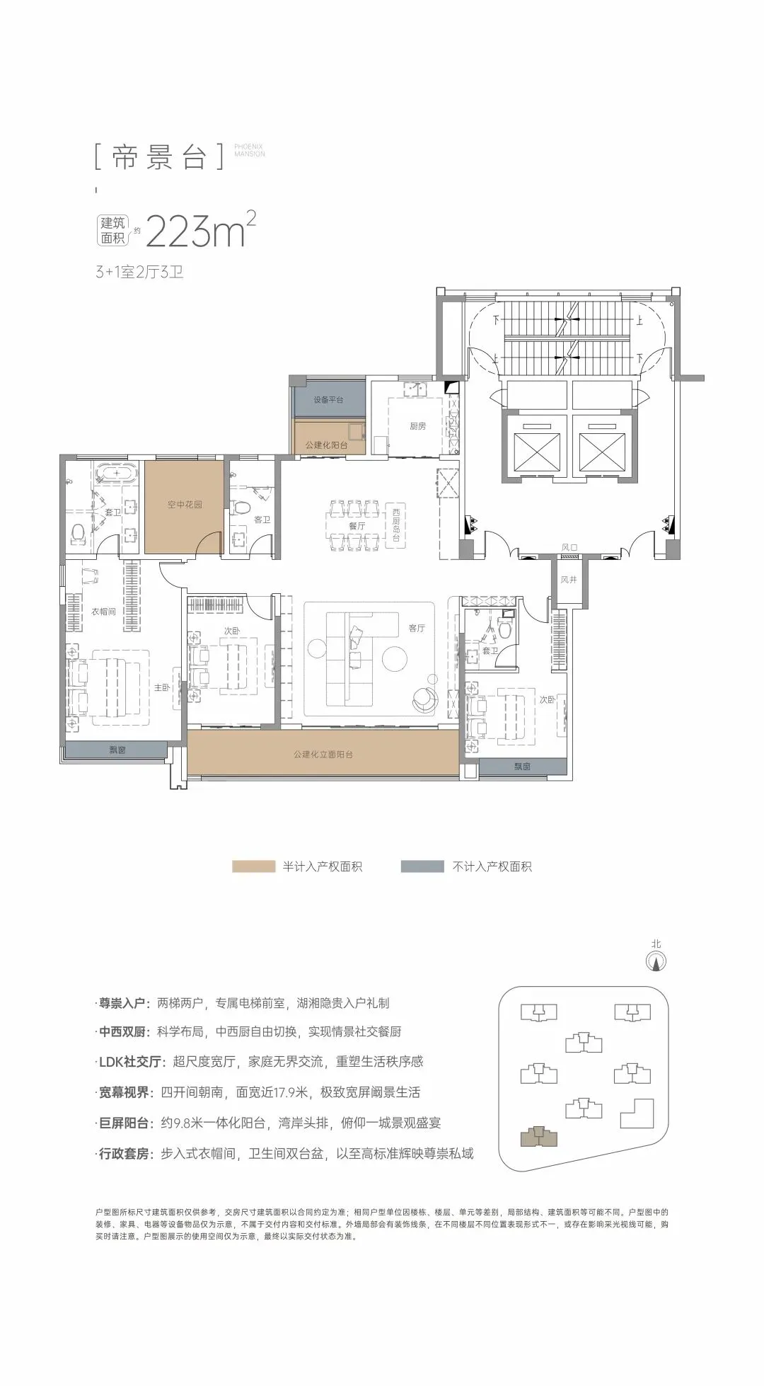 约223㎡纯粹平层:中西双厨、LDK社交厅、面宽约17.9米、4开间朝南、约9.8米一体化阳台、行政双套房(步入式衣帽间、浴室双台盆)。