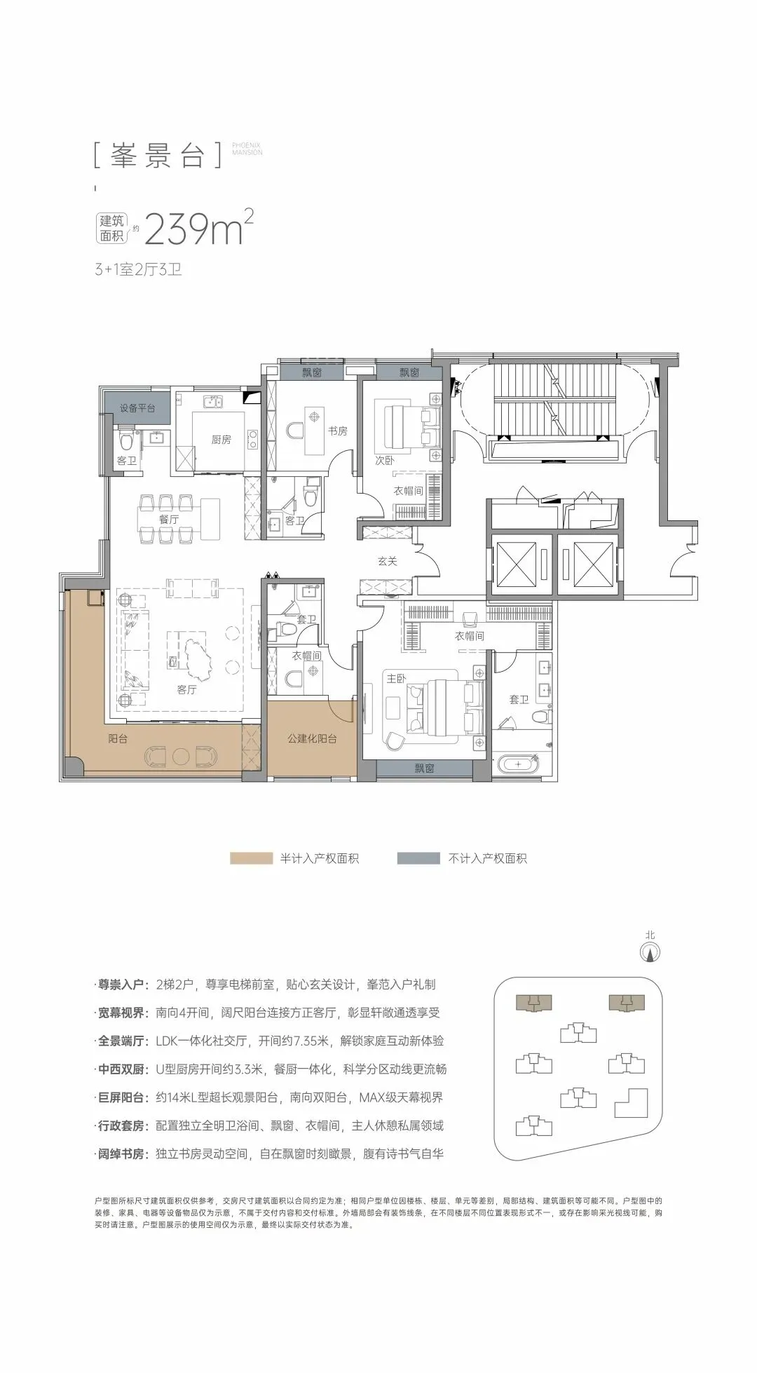 约239㎡峯境平层:中西双厨、LDK全景端厅、270°环幕阳台,4开间朝南、行政双套房(步入式衣帽间、浴室双台盆)