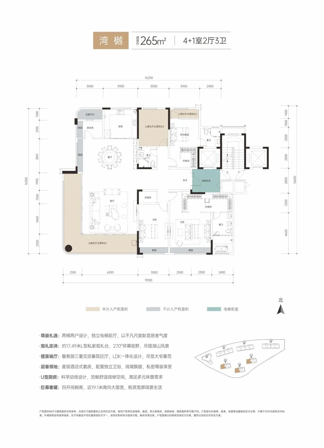 约265㎡低密洋房:两梯两户,中西双厨、LDK社交厅、4开间朝南、270度环幕阳台、约19.1米南向大面宽,双套房主卧。