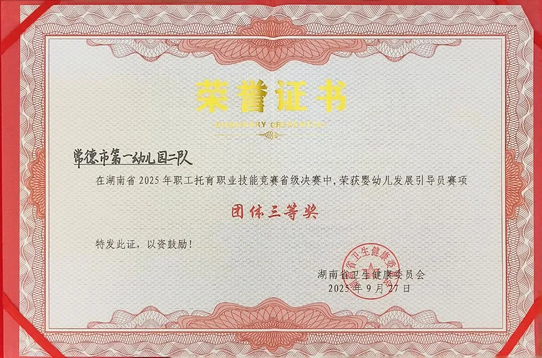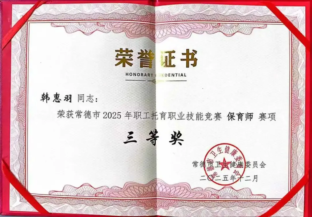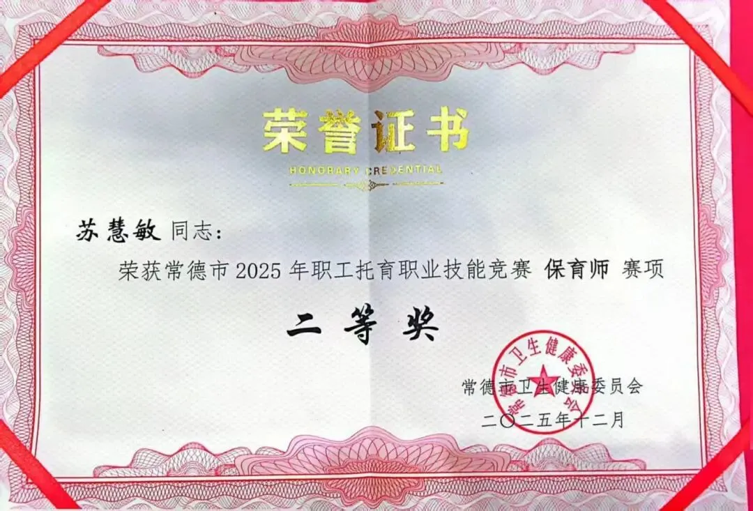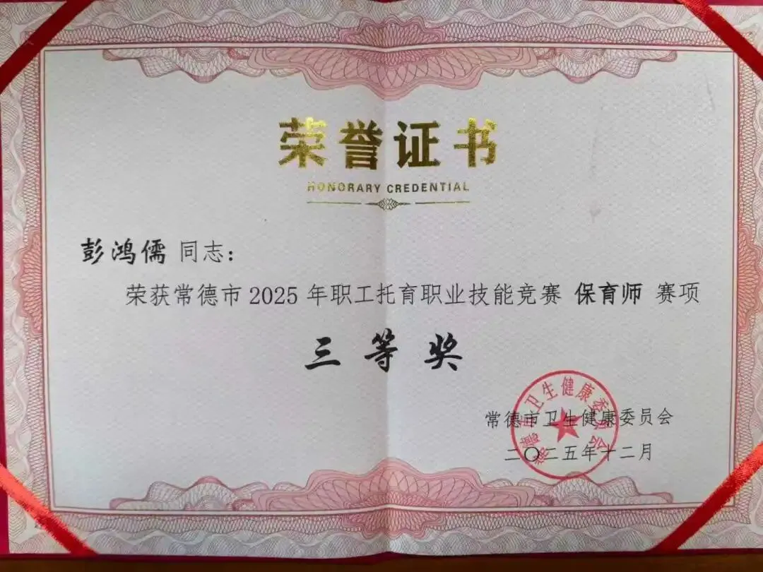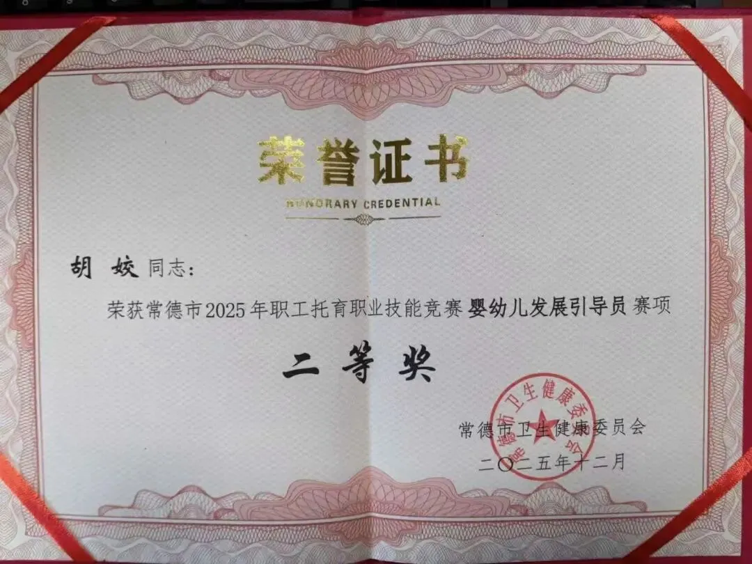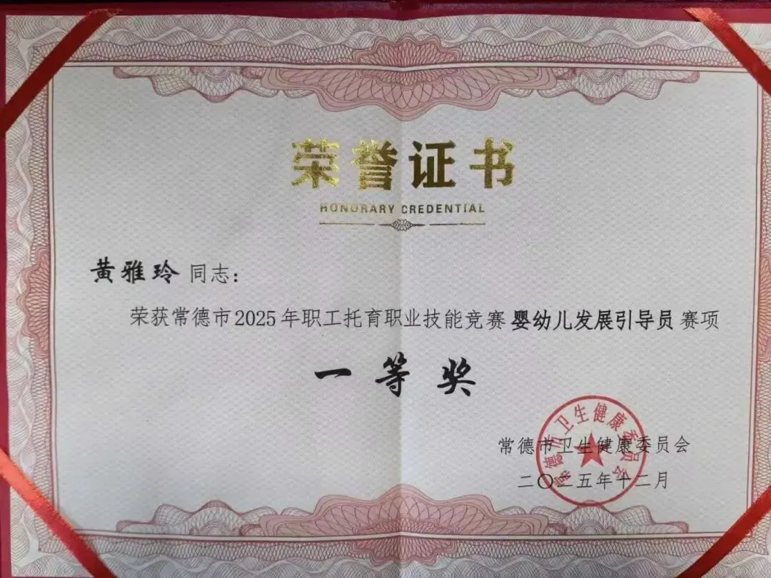 在常德市2025年职工托育职业技能竞赛中,黄雅玲荣获一等奖,李尚钦、胡姣、苏慧敏、张金淋荣获二等奖,韩惠羽、彭鸿儒荣获三等奖。