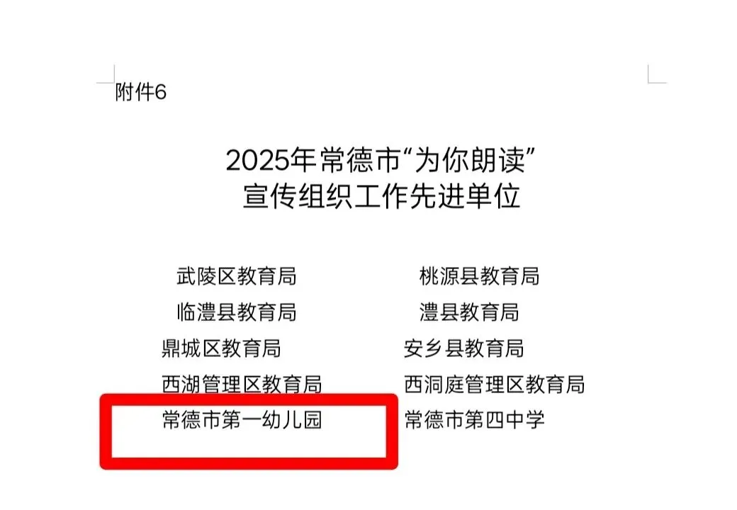 深耕半载勤,繁花满园新。在第六届湖南省基础教育教学成果评选中荣获“二等奖”。在湖南省 2025 年职工托育职业技能竞赛省级决赛中,荣获团体二等奖、团体三等奖;第二届“园丁杯”市直教育系统教职工气排球比赛其他单位组中荣获“冠军”;常德市市直教育系统教职工合唱比赛中荣获“三等奖”;2025年常德市“幼儿园教育能手”竞赛活动中,被评为“优秀组织奖”;常德市“为你朗读”宣传组织工作先进单位;常德市“书香幼儿园”;曹阳、李然、陈舒越、苏慧敏被评为“书香幼师”;15名幼儿荣获“书香宝贝”称号。