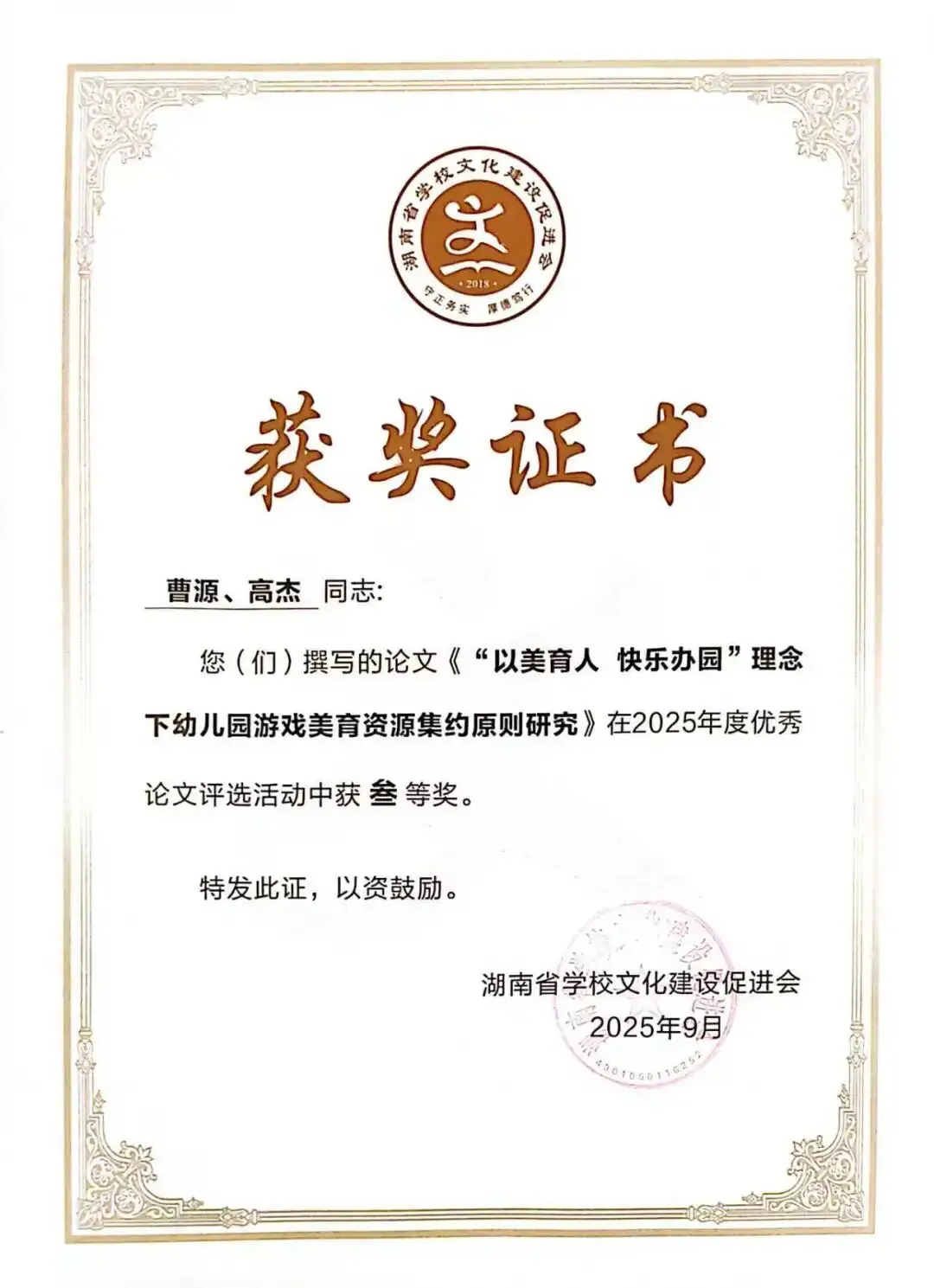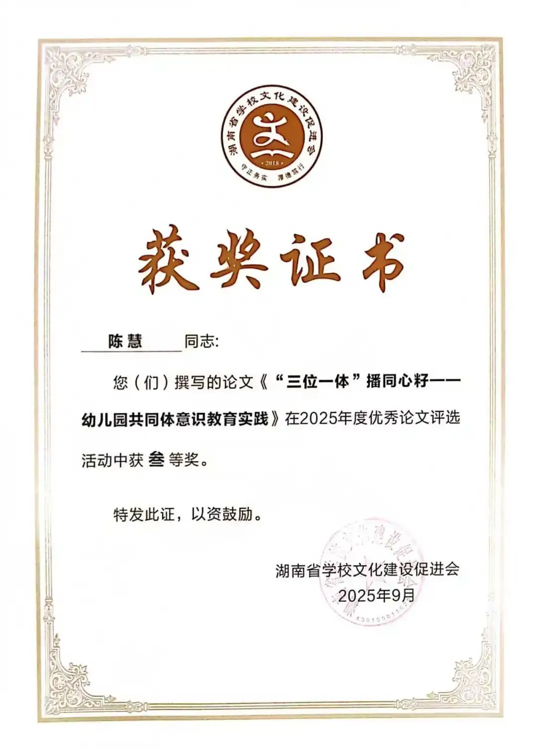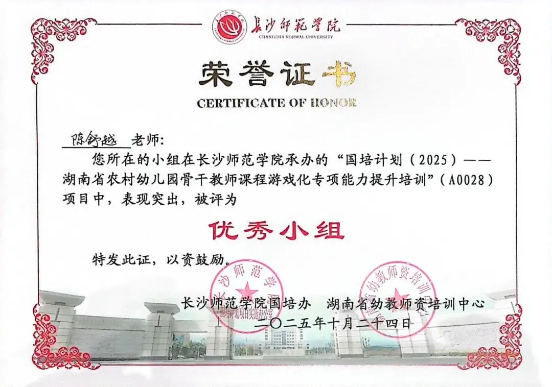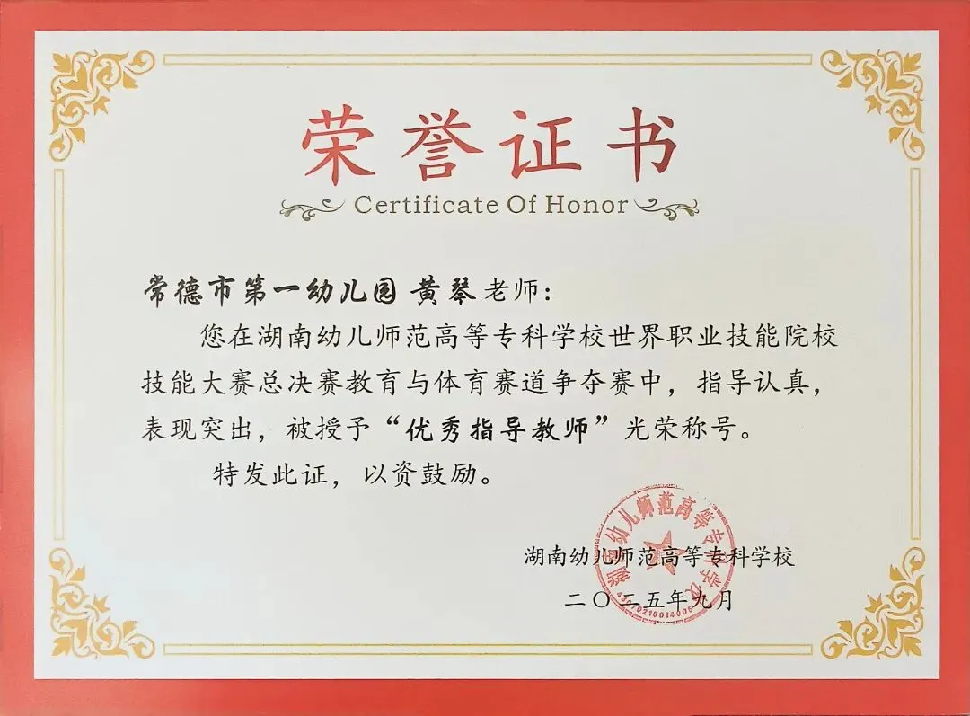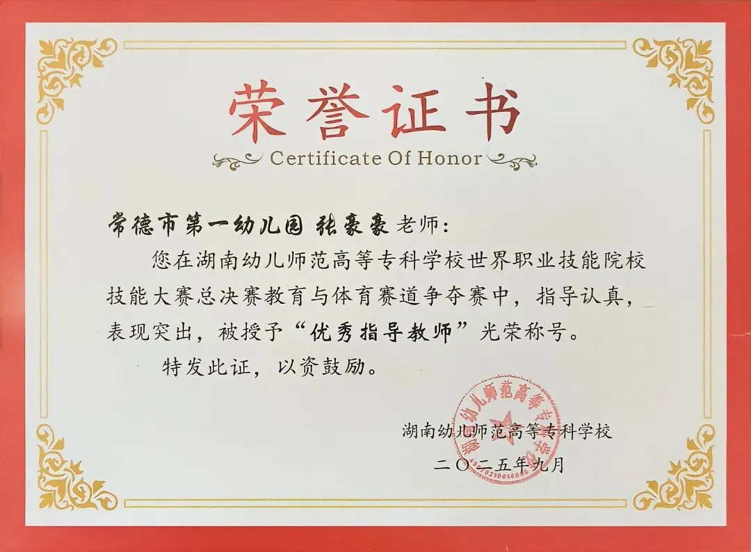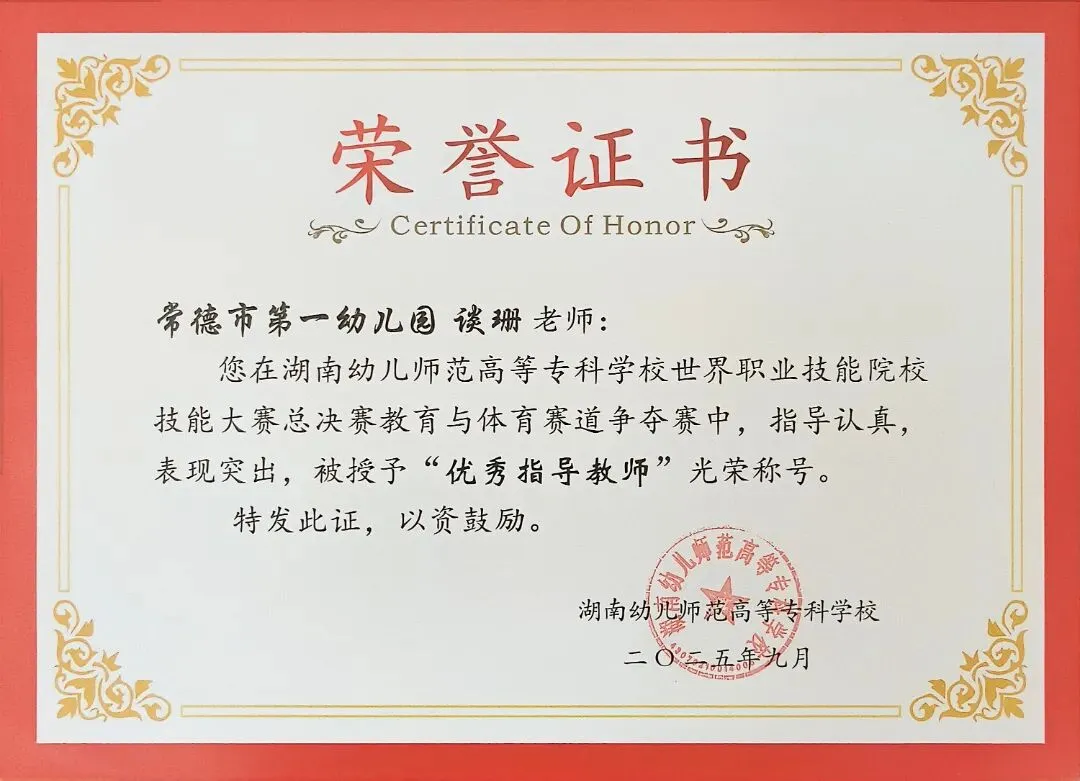 德才兼备立榜样,躬身示范启新程。谈珊、黄琴、张豪豪在湖南幼儿师范高等专科学校世界职业技能院校技能大赛总决赛教育与体育赛道争夺赛中荣获“优秀指导教师”称号;陈慧被评为常德市“师德标兵”;陈舒越参加培训的学习小组在“国培计划(2025)--湖南省农村幼儿园骨干教师课程游戏化专项能力提升培训”(A0028)项目中被评为“优秀小组”。