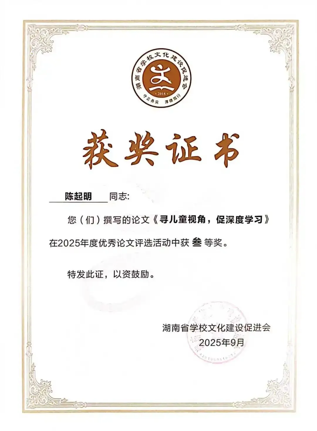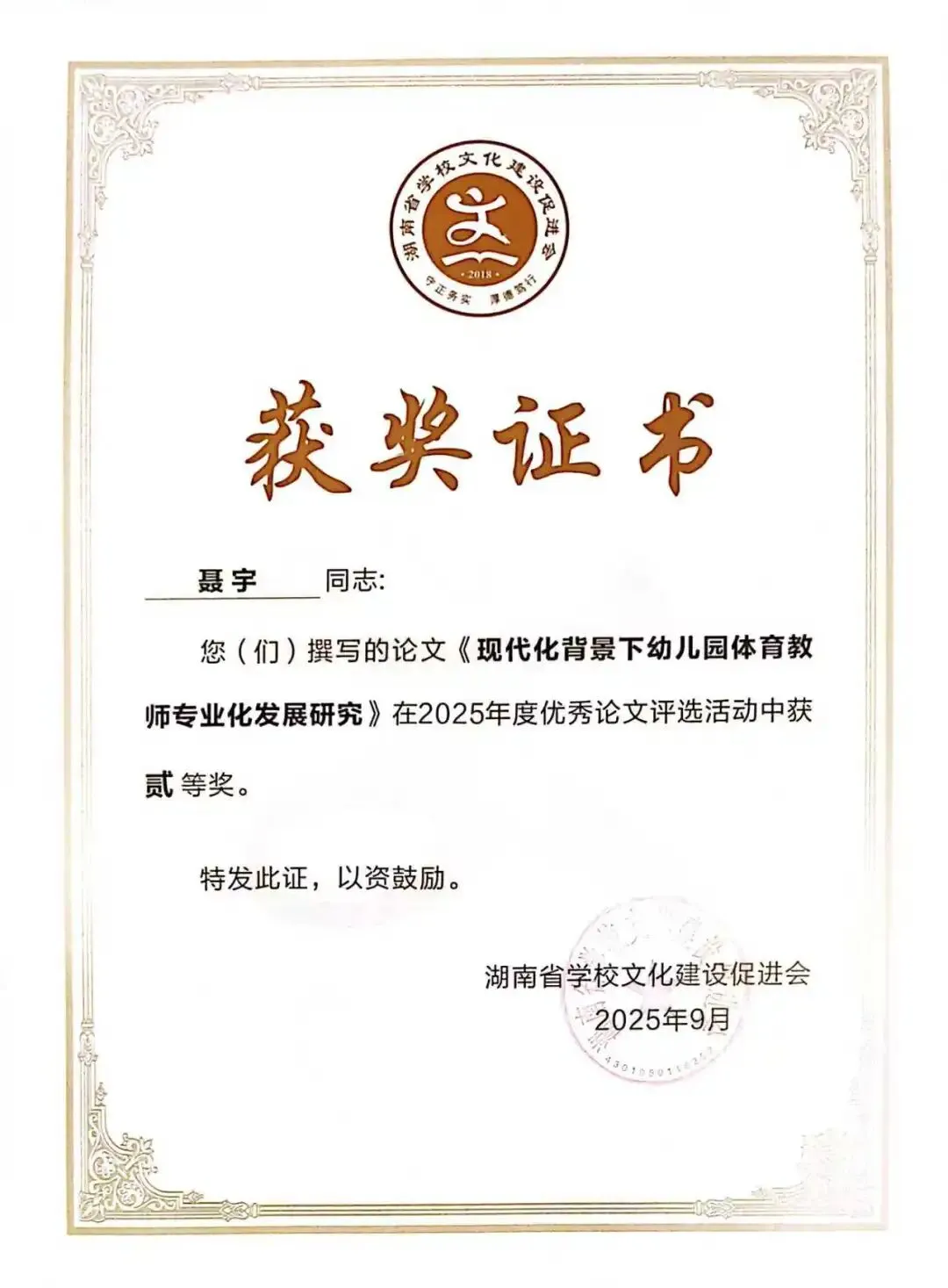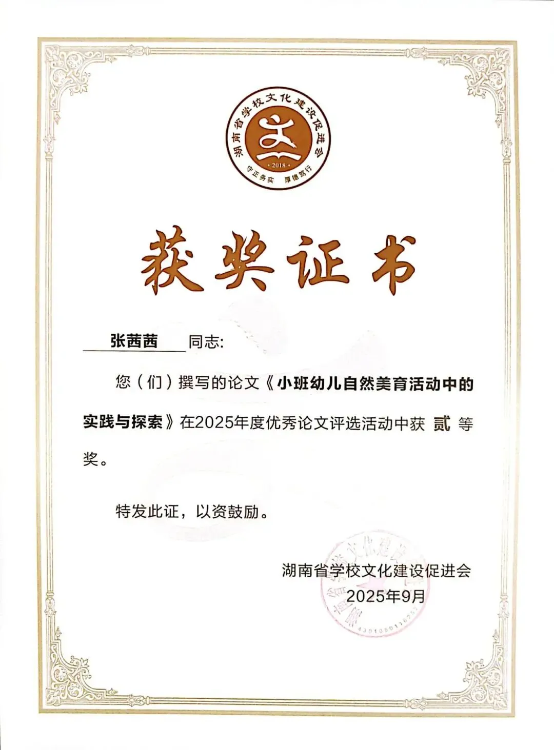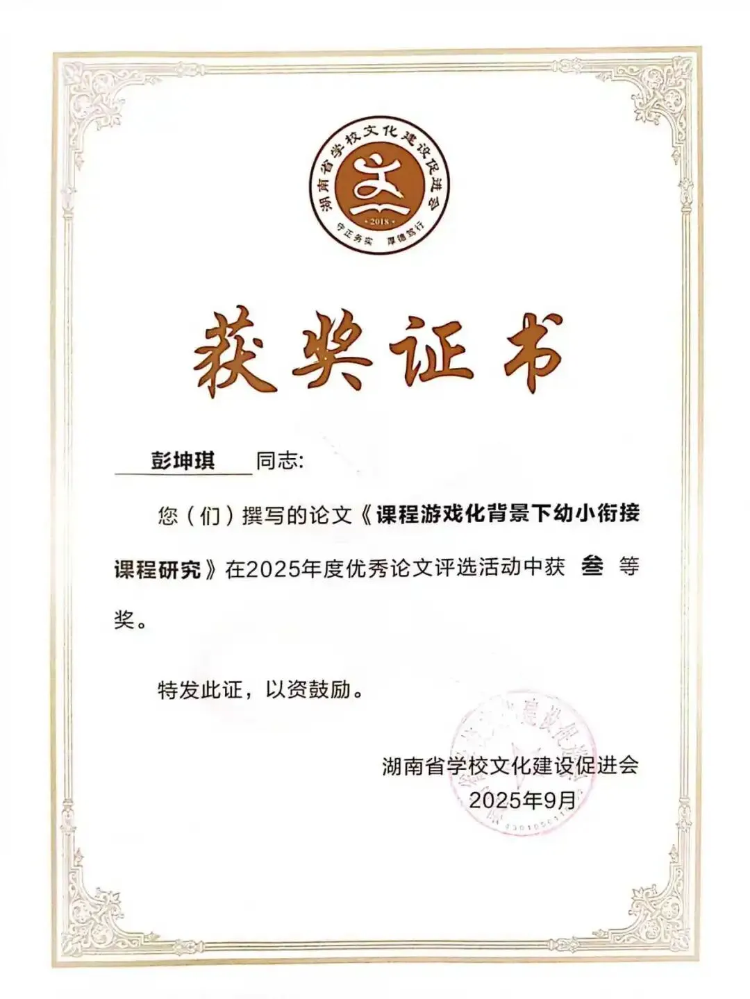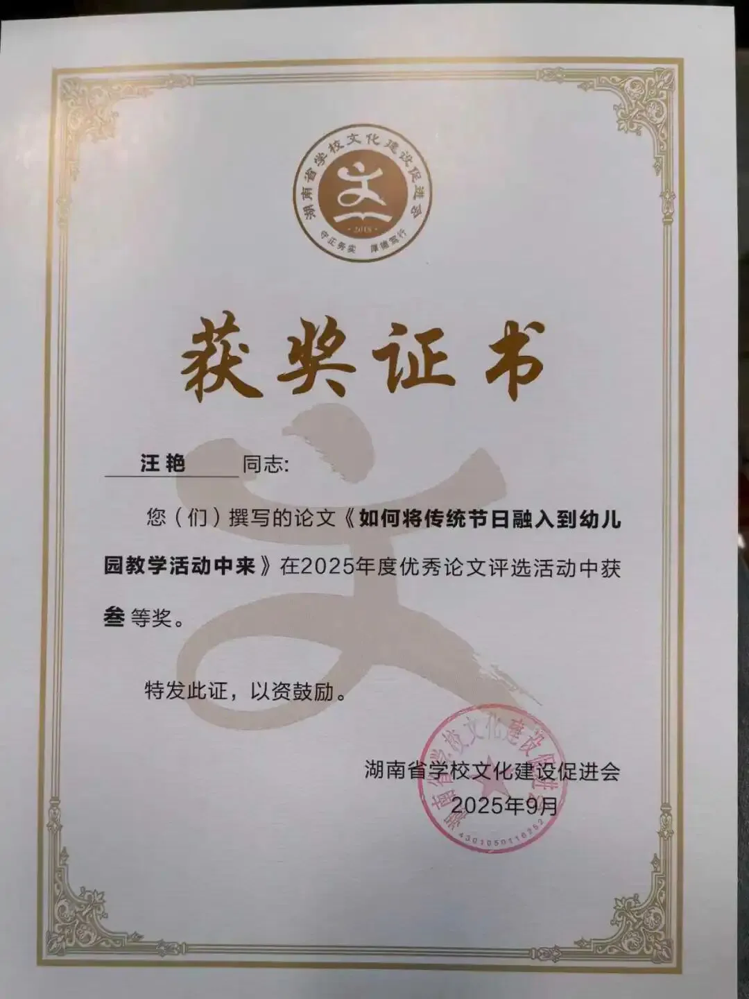 德才兼备立榜样,躬身示范启新程。谈珊、黄琴、张豪豪在湖南幼儿师范高等专科学校世界职业技能院校技能大赛总决赛教育与体育赛道争夺赛中荣获“优秀指导教师”称号;陈慧被评为常德市“师德标兵”;陈舒越参加培训的学习小组在“国培计划(2025)--湖南省农村幼儿园骨干教师课程游戏化专项能力提升培训”(A0028)项目中被评为“优秀小组”。