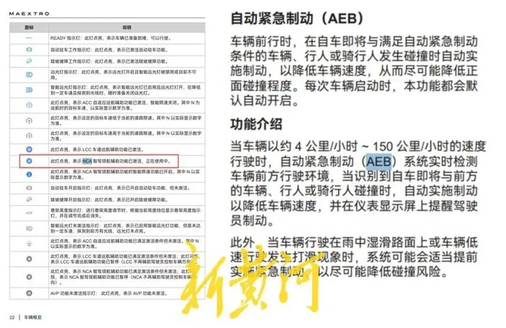 记者从涉事车辆行车记录视频中看到,车辆仪表盘显示其全程处于“NCA”(智驾领航辅助)开启状态。在视频最后一秒,系统由NCA状态切换至AEB(自动紧急制动)状态。