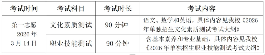 学校按第一志愿和第二志愿分别组织单招考试。第一志愿考试时间为2026年3月14日。若第一志愿生源不足,未完成单招计划,学校将组织第二志愿考试,参考对象为第二志愿报考了我校未完成计划专业且未被第一志愿学校录取的考生。第二志愿考试时间为2026年4月11日。各科目的具体考试时间及地点以准考证上载明的信息为准。