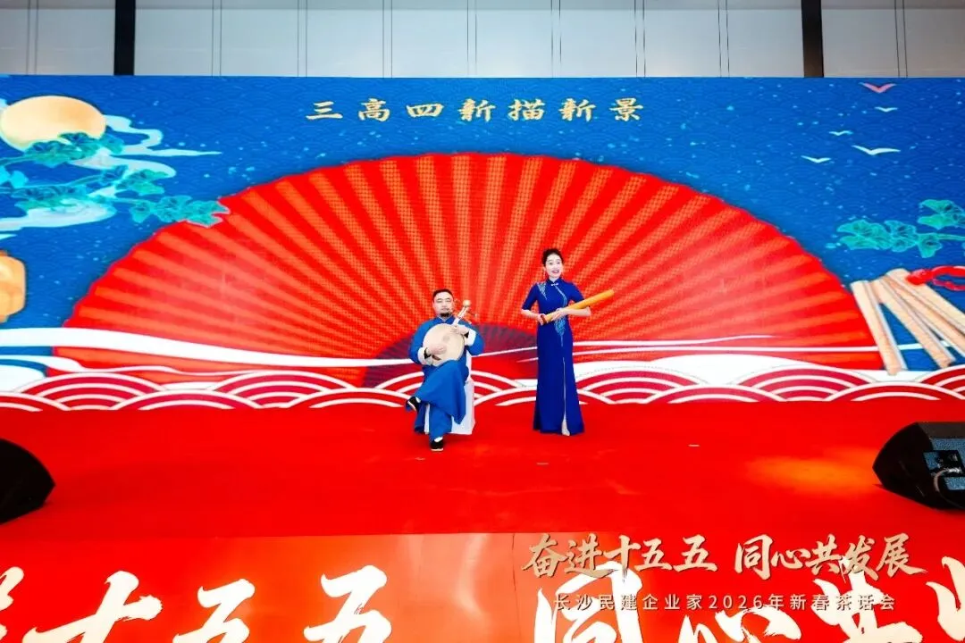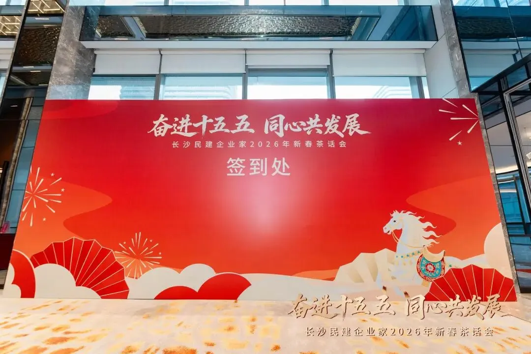 PART 01以茶为引,从“会场”走进“心场”会场以“奋进十五·同心共发展”为主题,整体布置庄重而温暖。红色主视觉在灯光映衬下进行相应的醒目,新春气息与民建自然元素融合,让人一走进来,便感受到一种熟悉而笃定的氛围。这不是一场形式化的会议,而是一场让人愿意坐下来、静下心来交流的相聚。
