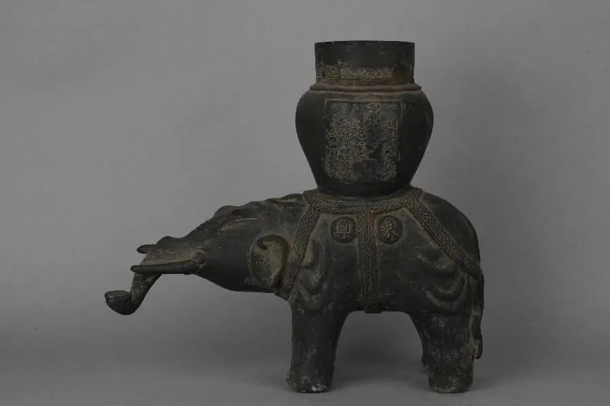 形态特征:该器为象背上立一罐形器,罐为直口,象身肥硕,颈下、腹下、臀部系带,带上饰连续三角纹,长鼻上卷,尾自然下垂,四肢粗壮,象身一侧有阳文楷书“象尊”二字,罐体有阳文楷书铭文:“湖南长沙府安化县学圣庙 道光六年冬 兵部侍郎江苏巡抚赏戴花翎陶澍敬制 ”。