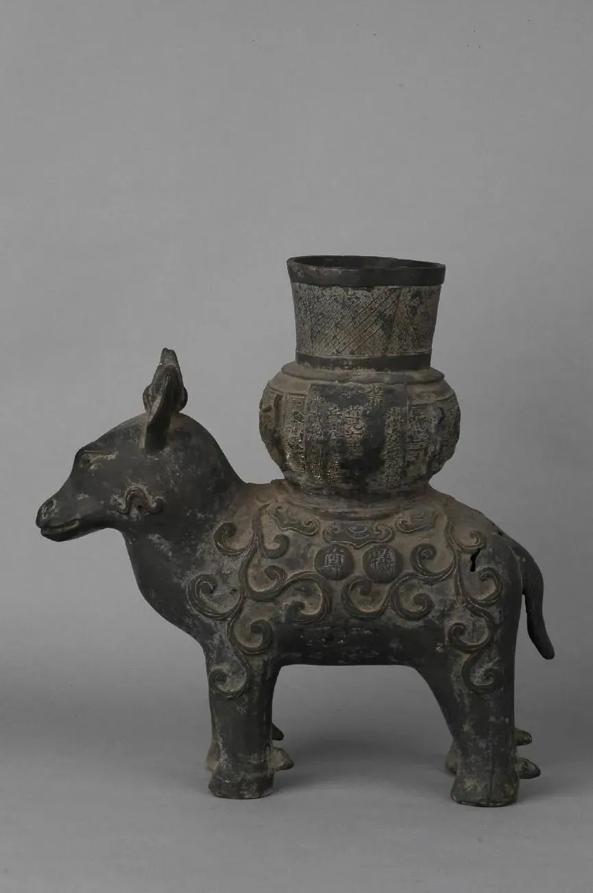 形态特征:牺背立一敞口,颈部满饰菱形纹,前后方和右侧为蟠龙纹饰,左侧有阳文“牺尊”二字,头顶为元宝形角,双立耳,后背部有两处残破。尊腹左侧有阳文楷书铭文“湖南长沙府安化县学圣庙 道光六年冬 兵部侍郎江苏巡抚赏戴花翎陶澍敬制 ”。