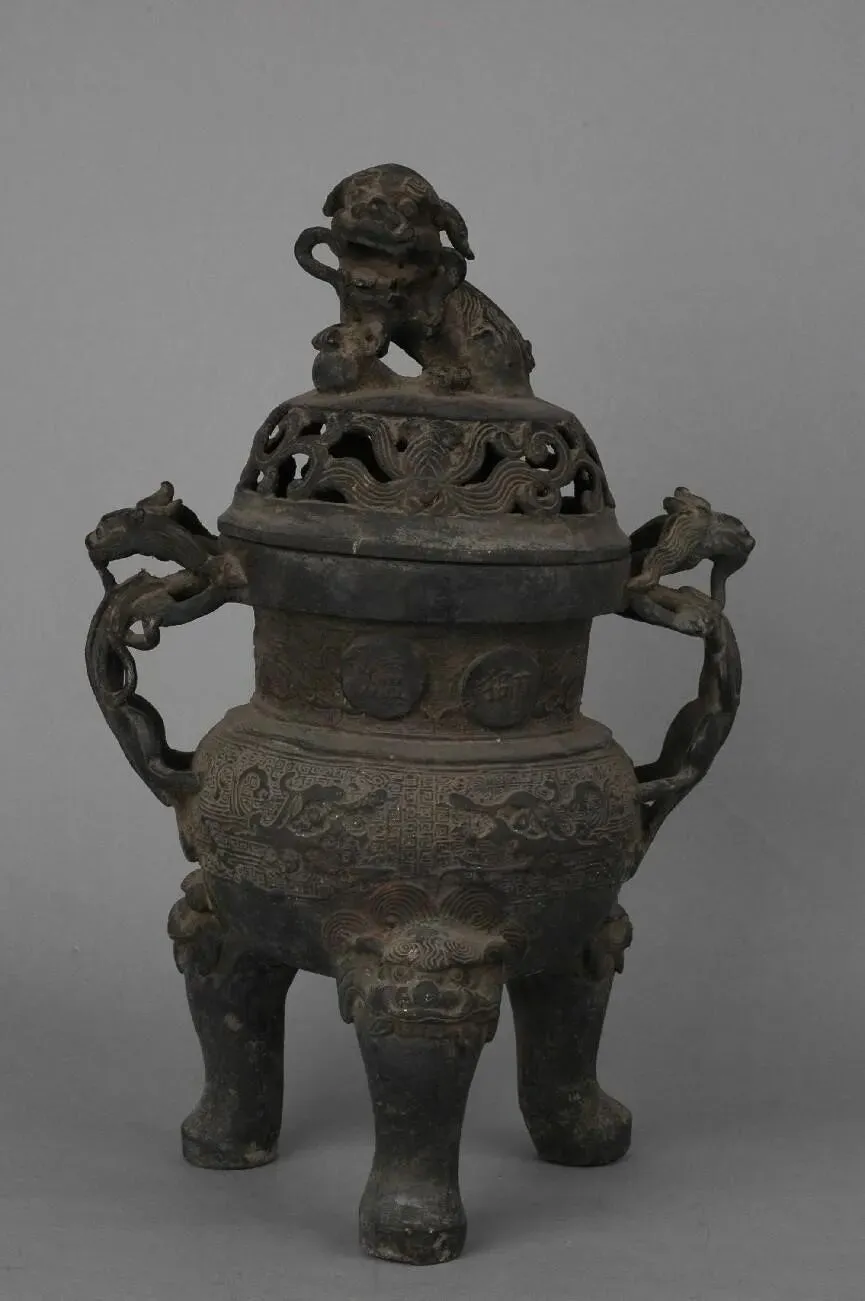 形态特征:香炉为盘口,束颈,鼓腹,三兽蹄足,腹与盘口中间两侧有盘龙纹饰,盖顶有卧座狮子前脚踏球,盖身有一圈镂空枝蔓,右侧颈部有阳文“狮炉”二字。炉身有阳文楷书铭文“湖南长沙府安化县学圣庙 道光六年冬 兵部侍郎江苏巡抚赏戴花翎陶澍敬制 ”。