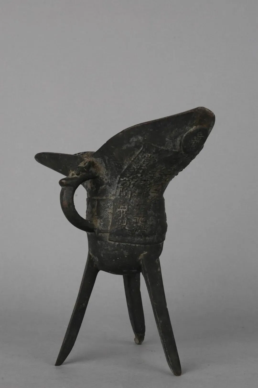 形态特征:敞口,圆腹,圜底,三棱形三足,肩腹部一侧附蟠龙纹,半环形执手,上部有一“爵”字,外壁有阳文楷书铭文“湖南长沙府安化县学圣庙 道光六年冬 兵部侍郎江苏巡抚赏戴花翎陶澍敬制 ”。