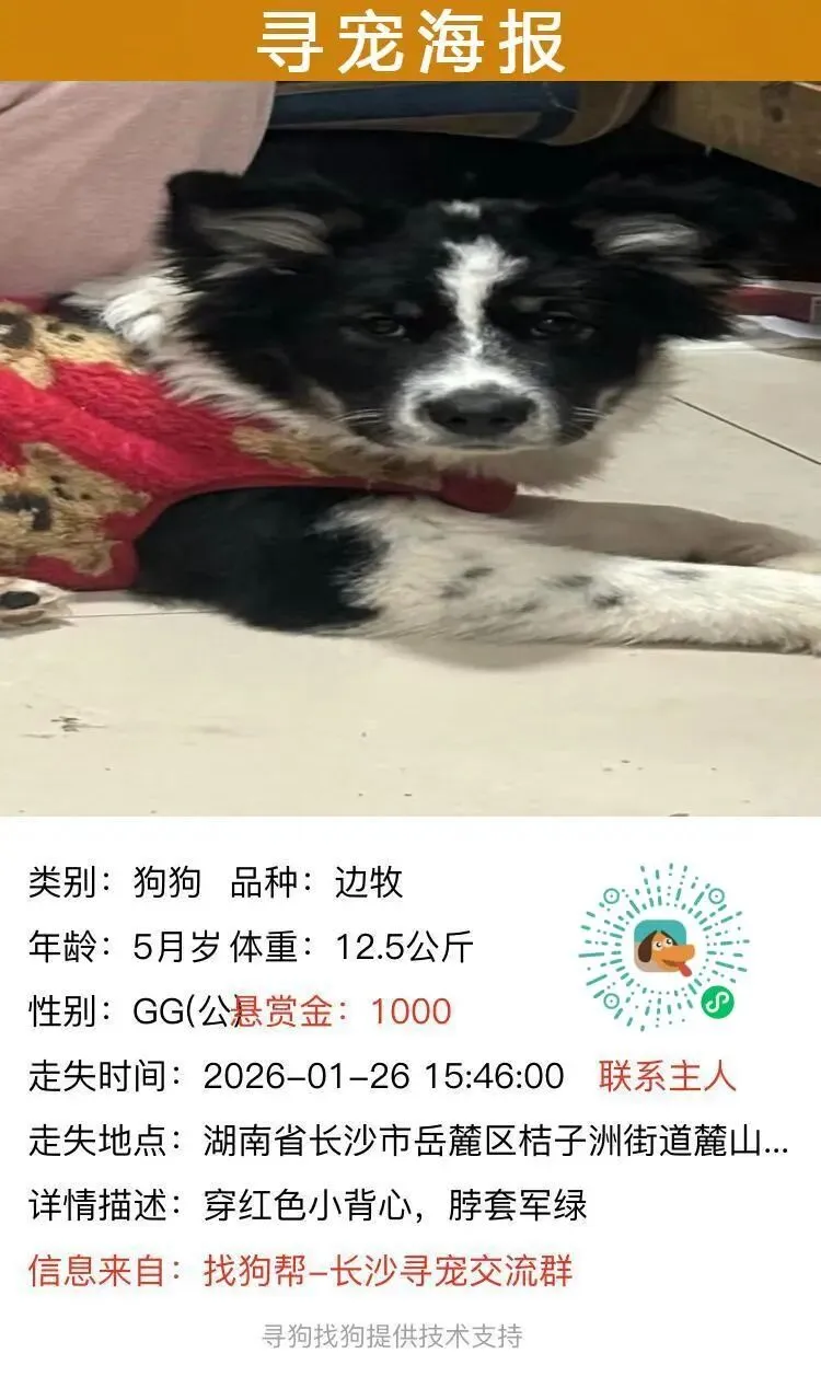 #长沙寻狗# 岳麓区桔子洲街道麓山路36号湖南师范大学附近走失一只边牧,如有好心人看到或者收留请联系主人或本平台