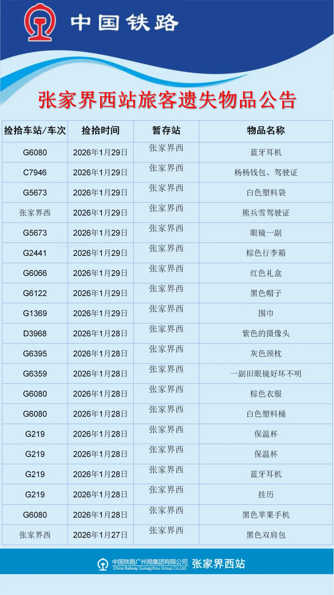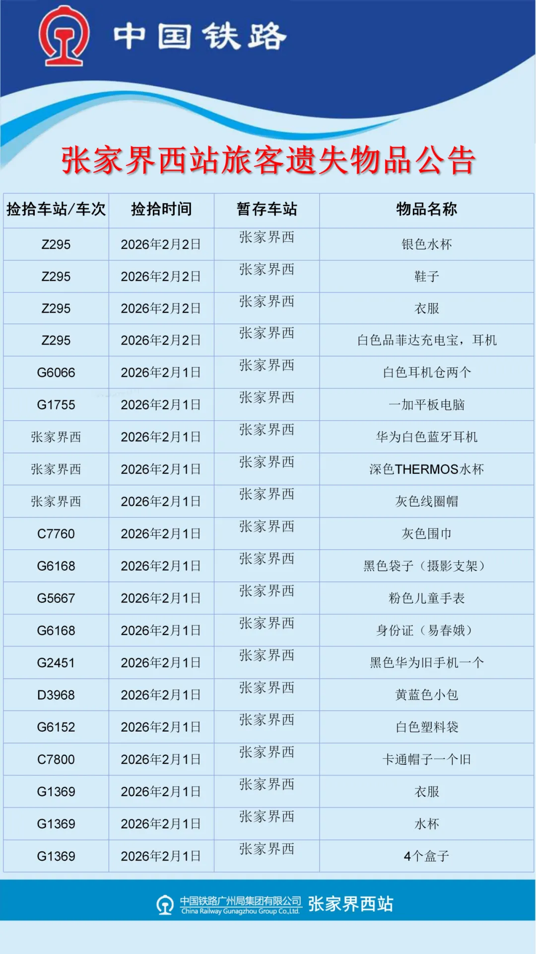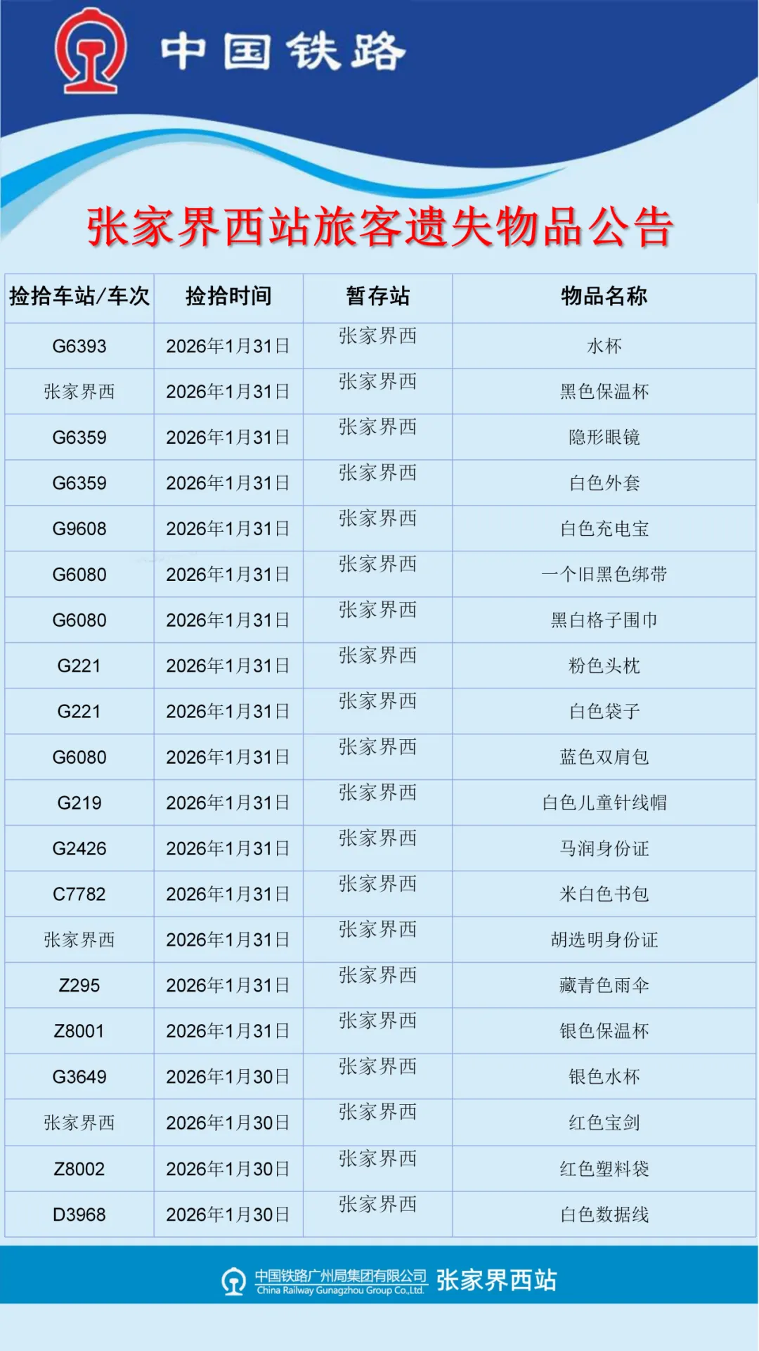张家界西站失物招领公告(2026年1月26日-2月2日更新)