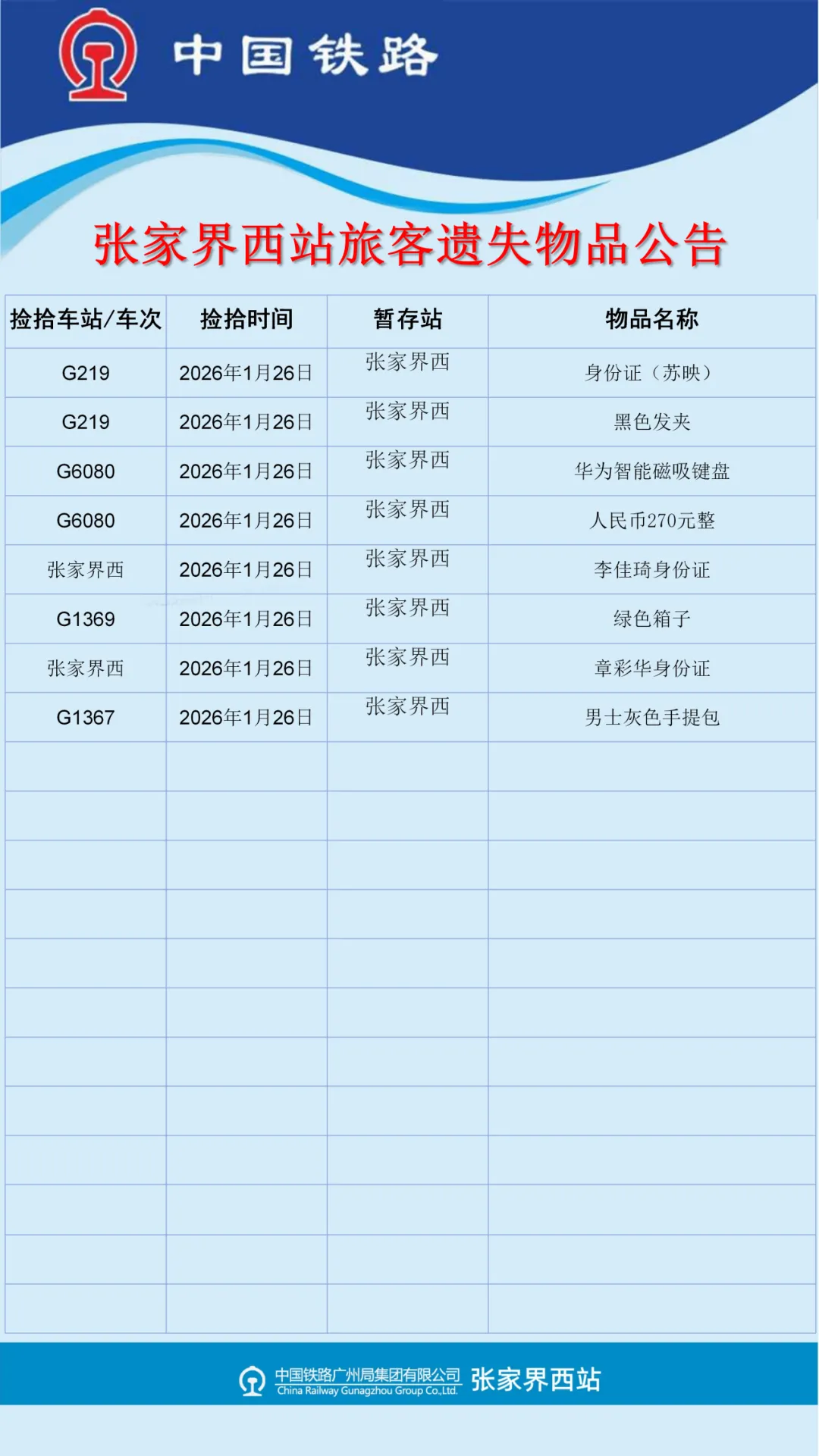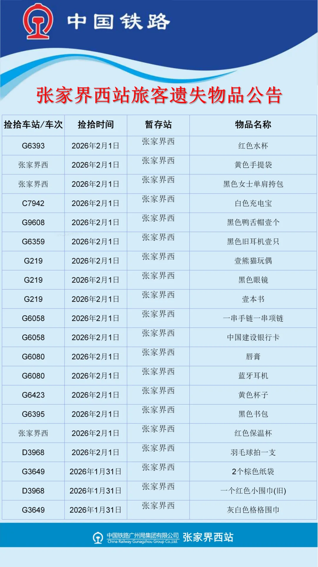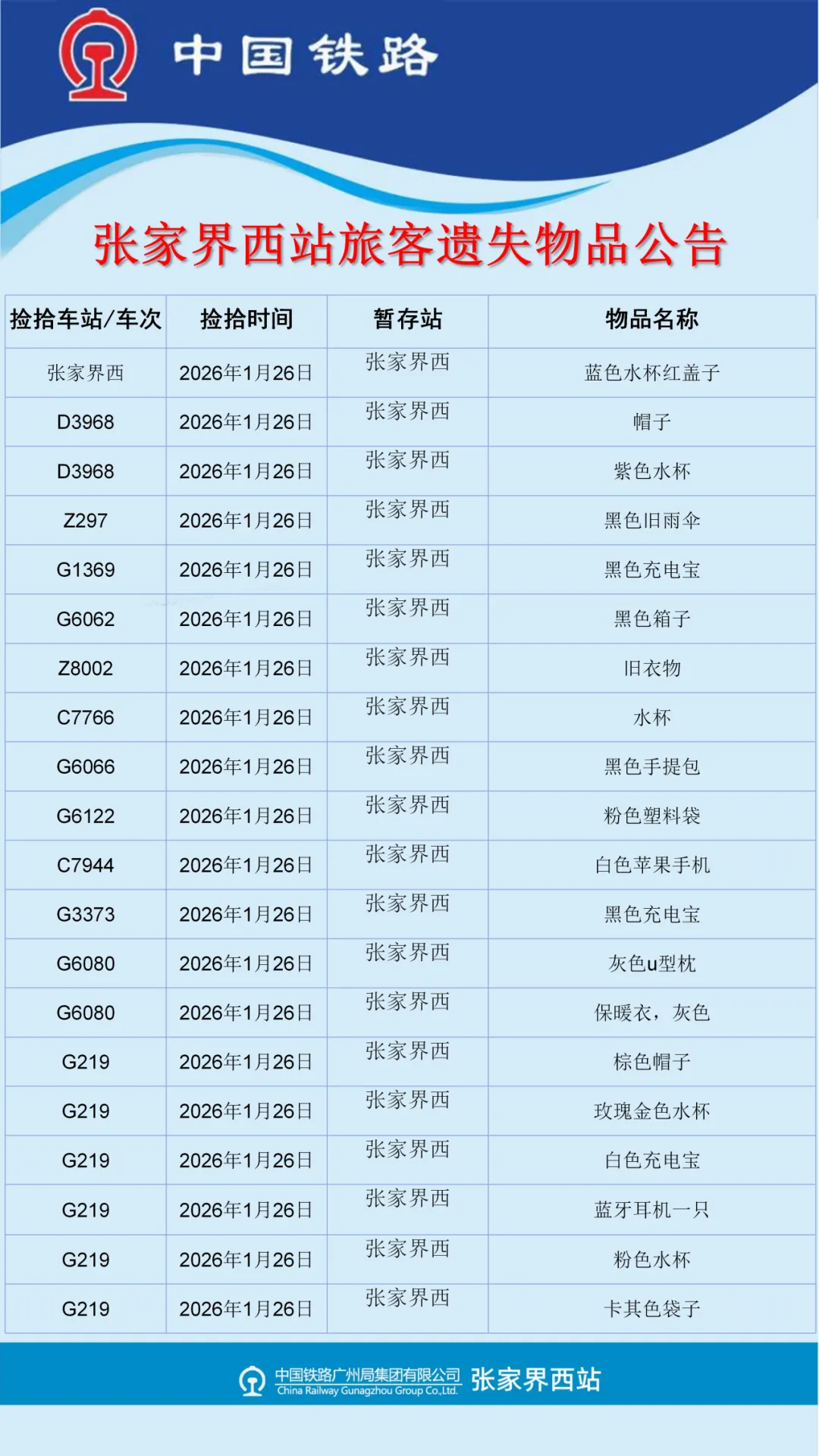 张家界西站失物招领公告(2026年1月26日-2月2日更新)