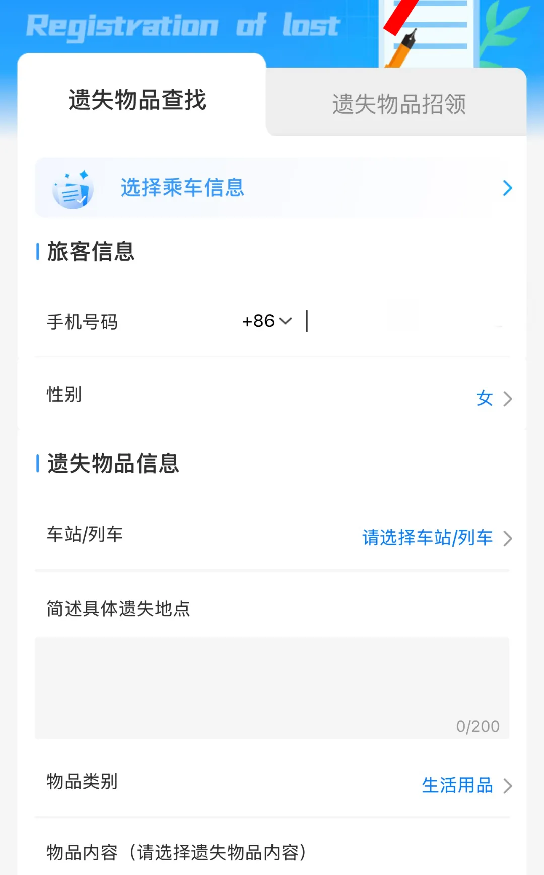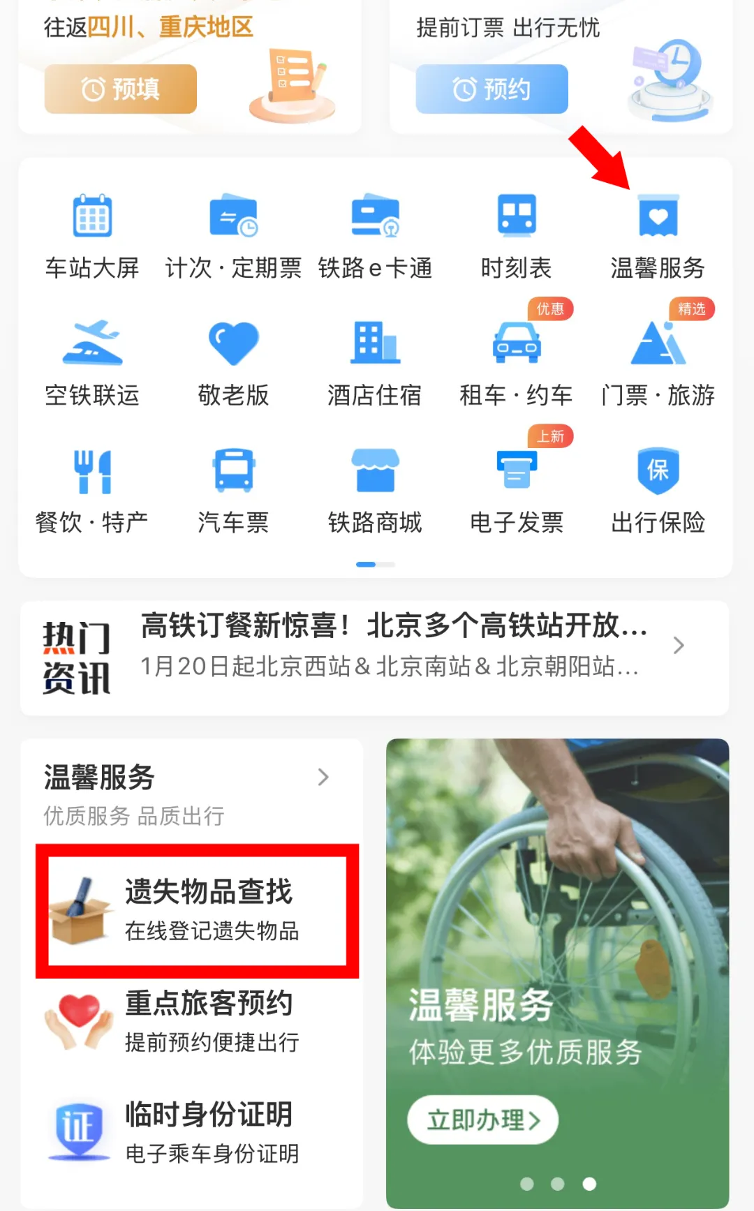 打开铁路12306App,点击温馨服务,选择遗失物品查找。进入登记界面后,选择乘车信息,填写旅客信息以及遗失物品等相关信息,确认提交后,可以在右上角进度查询中查看物品寻找进度。