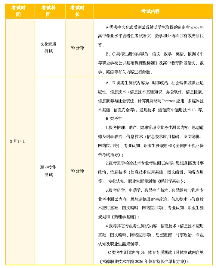 3.C类考生。由学院依据《常德职业技术学院2026年体育特长生单招方案》统一组织文化素质测试和体育专项测试。文化素质测试主要依据《中等职业学校公共基础课课程标准》及高中教育阶段语文、数学、英语等有关内容进行命题及考试,采取笔试方式进行,满分300分。体育专项测试详见附件《常德职业技术学院2026年体育特长生单招方案》,满分300分。