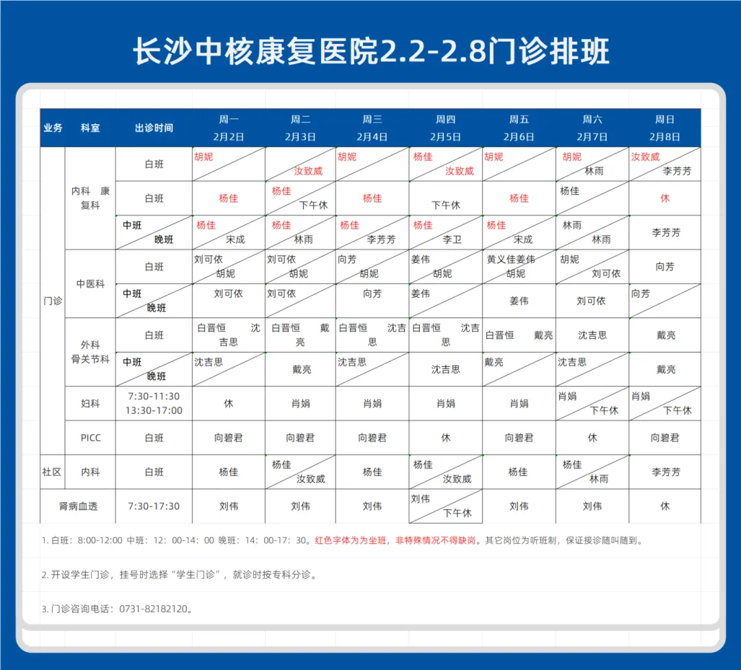 【就医资讯】长沙中核康复医院2026.2.2-2.8门诊排班表