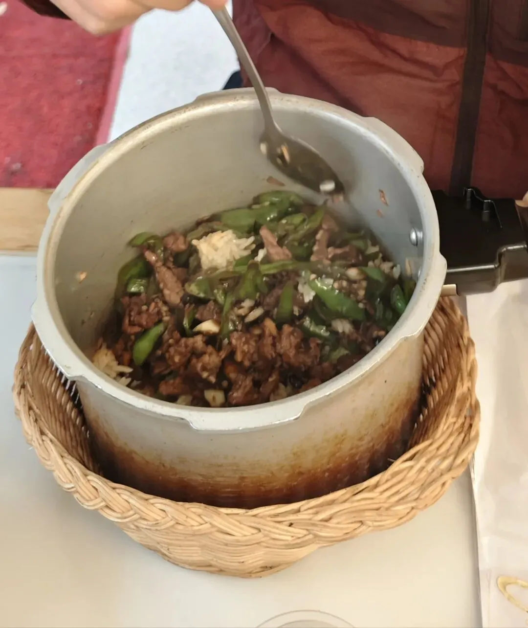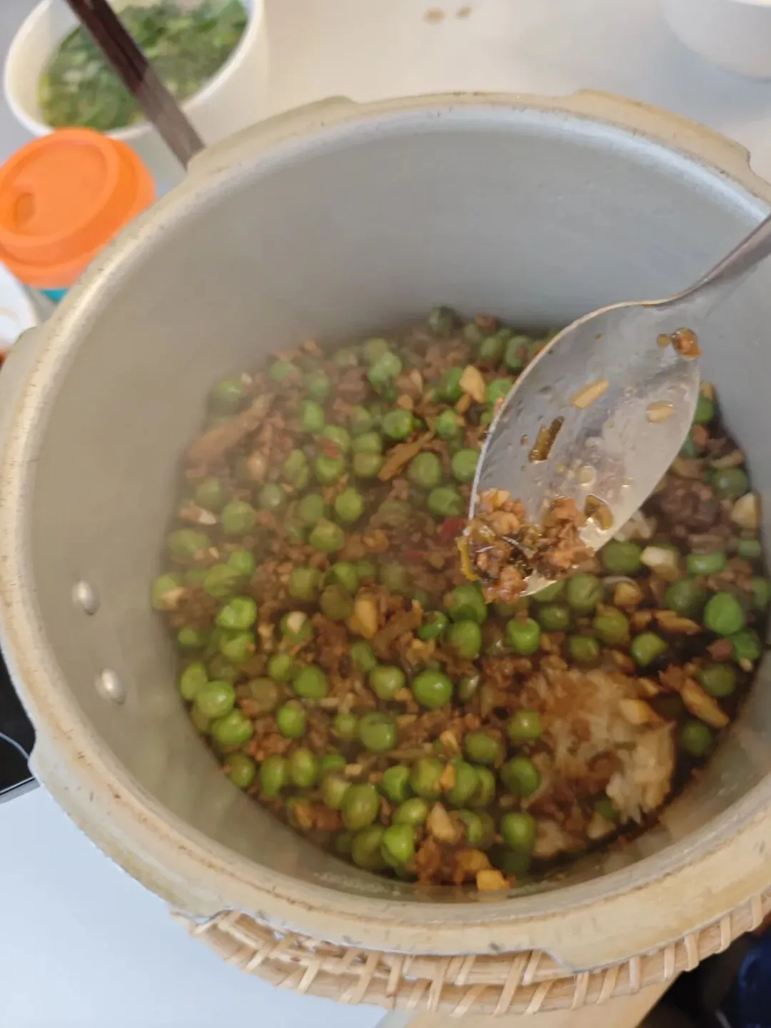 小高压锅煮的米饭,配上现炒的菜,高压锅底部有一层锅巴。