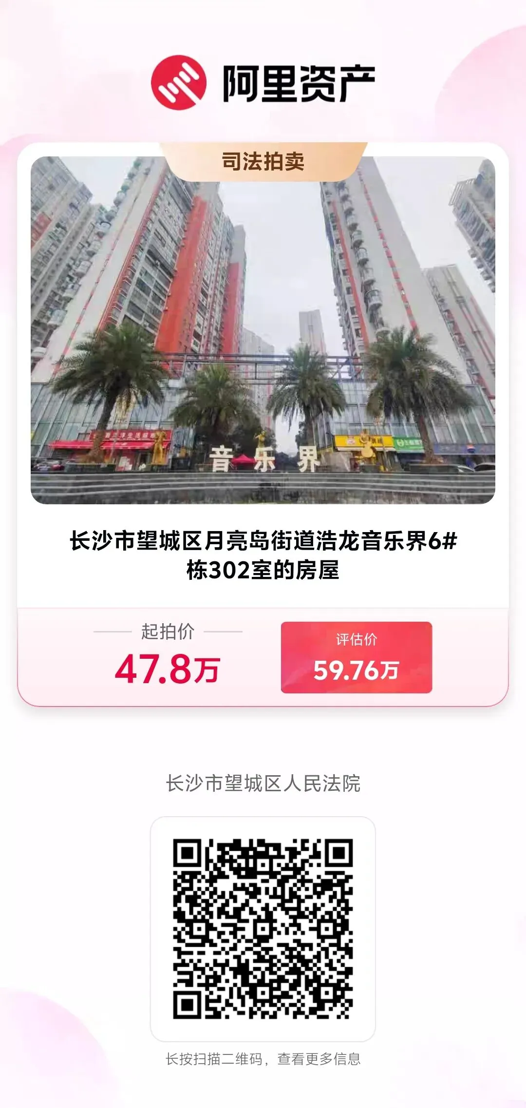 长沙市望城区月亮岛街道浩龙音乐界6#栋302室的房屋将于2026年3月6日10:00时至2026年3月7日10:00时(延时的除外)在长沙市望城区人民法院淘宝网司法拍卖网络平台上(http://sf.taobao.com/0731/09,户名:长沙市望城区人民法院)公开进行第二次拍卖活动。
