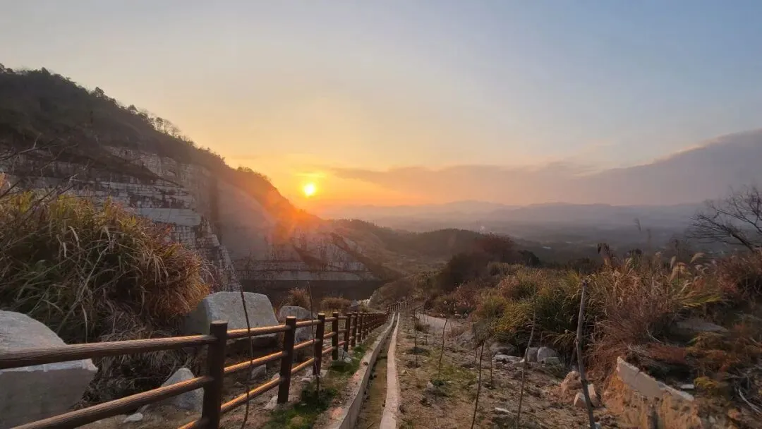 五龙山水库大坝下面是北山镇新桥村(社区),五龙山水库这边是安沙镇五龙山村。从北山镇新桥村沈家老屋附近,天雷山废弃矿坑(废弃采石场)处爬山(有人说,这是五龙山),废弃矿坑(采石场)水深不见底,爬上山顶看到日落,山顶还能看到不远处的黑麋峰。