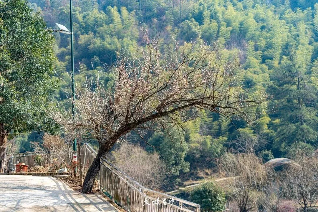 也可以去北山书屋旁的梅林,两万多株梅花连成一片花海,80亩的美人梅远看像粉色的雾,走近了,朱砂梅红得明亮,绿萼梅白中透绿,各有各的美。