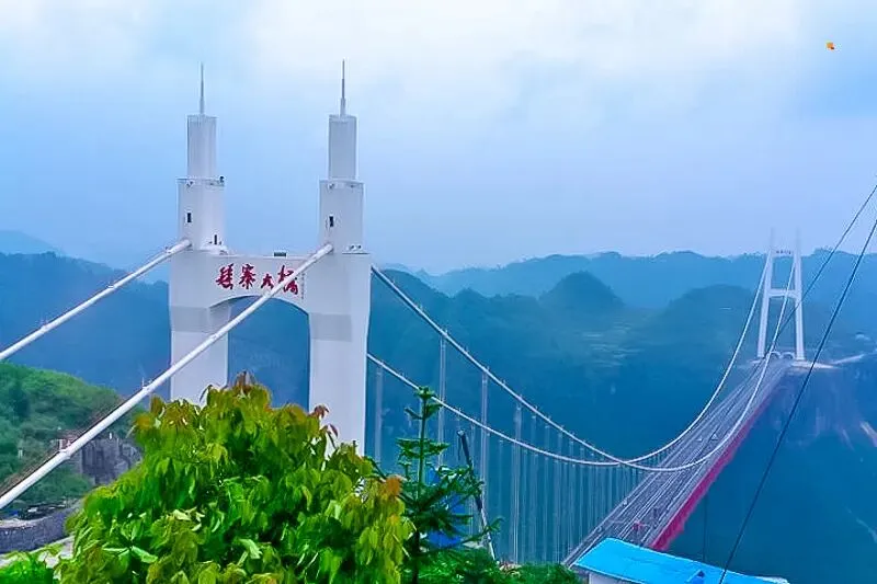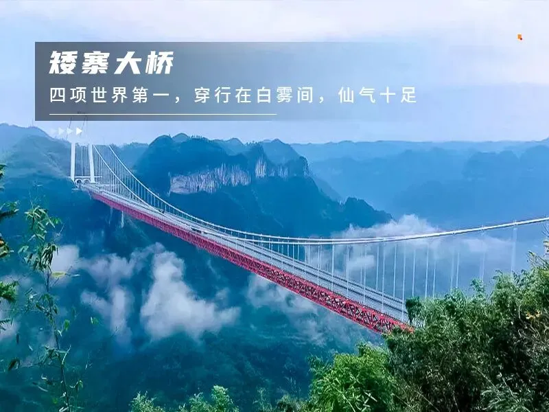 【矮寨悬索大桥景区】它被评为世界上最美的大桥, 大桥垂直高差达355米,主跨度1176米,车行在矮寨大桥上,低头是幽深的大峡谷,潺潺德夯河水经流而下,犹如在云中漫步一般。随后换乘景区观光车游览湘川公路上最险要的关卡——矮寨公路奇观,其地势之险、工程设计之巧妙居全国公路之冠。