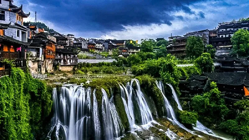 芙蓉镇是一个拥有两千多年历史的古镇,因宏伟瀑布穿梭其中,又称“挂在瀑布上的千年古镇”。这里被沈从文誉为山、水、木、石于一体最清奇、最美丽,有着挂在瀑布上“千年古镇”之誉。融自然景色与古朴的民族风情为一体的旅游胜地,土家吊脚楼、青石板路,细雨中倘佯于此沁人心脾。作为猛洞河风景区的门户,真是一个寻幽访古的最佳景点。观瀑吊脚楼收藏了土家族三百多件文物,具有浓郁的文化气息,是土家文明最好的一个体现,还有溪州铜柱、电影海报艺术馆也是游客必游之地。