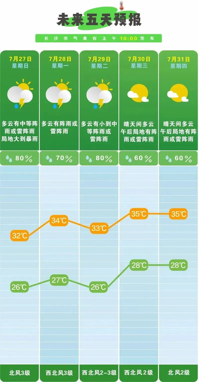 市气象台预计,7月27日到29日,受台风外围偏东风扰动影响,长沙多发局地强对流天气,点多分散,单点最大雨强20~50毫米/小时,雷雨时伴有6级以上阵风。