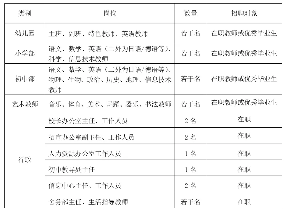 校办主任 | 1人 | 统筹行政事务、制度建设、会议组织、公文处理、对外联络等。 | • 本科及以上学历,中文、行政管理、教育学专业优先。 • 5年以上大型学校办公室工作经验。 • 文字功底强,协调能力好,执行力高。 |