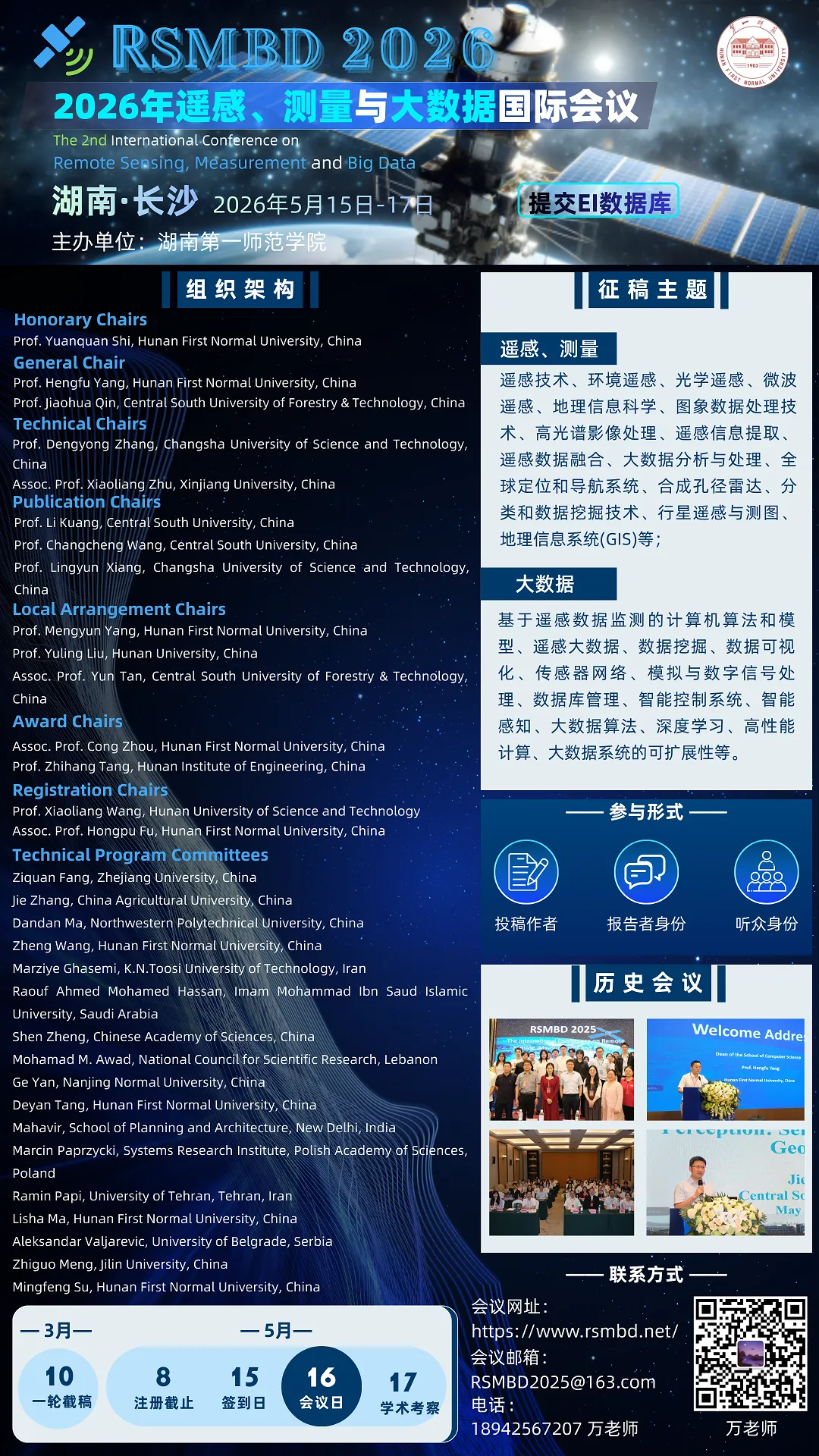 遥感、测量与大数据国际会议(RSMBD 2026)定于2026年5月15日-17日在湖南长沙隆重召开。会议录用并正式发表的论文,将全文收录于RSMBD 2026会议论文集,同步提交至EI Compendex数据库进行检索,为相关研究成果提供权威的学术展示与传播平台。
