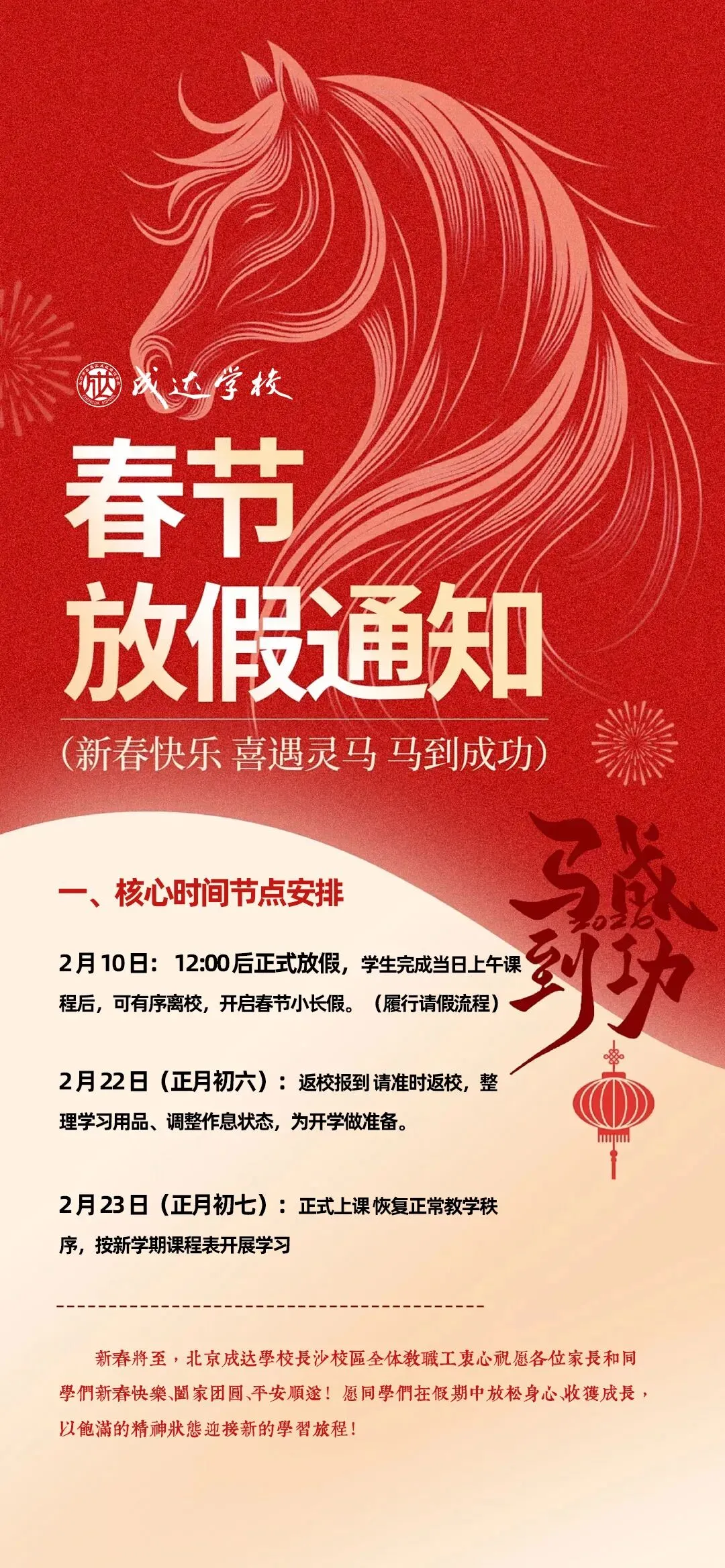 2 月 22 日(正月初六):返校报到 请准时返校,整理学习用品、调整作息状态,为开学做准备。