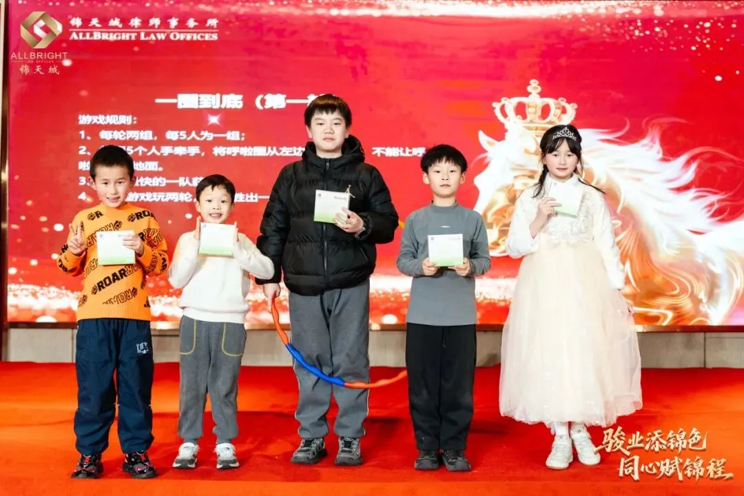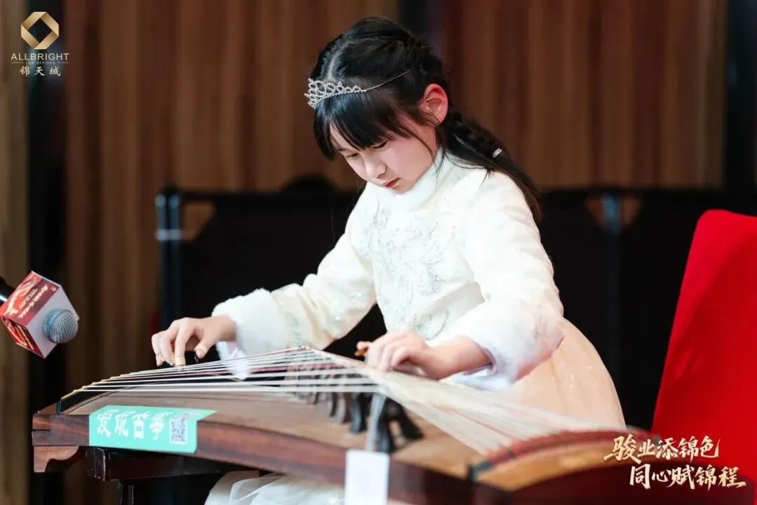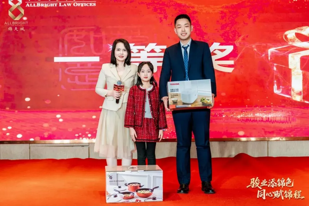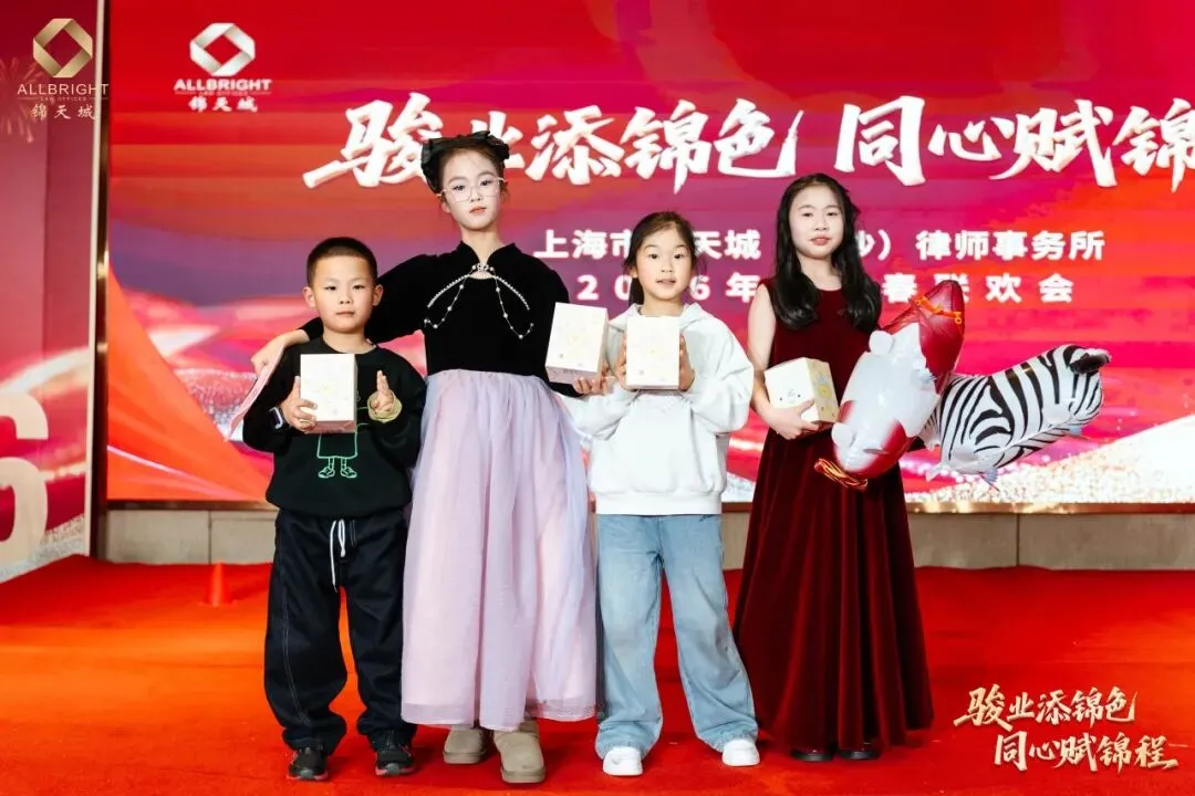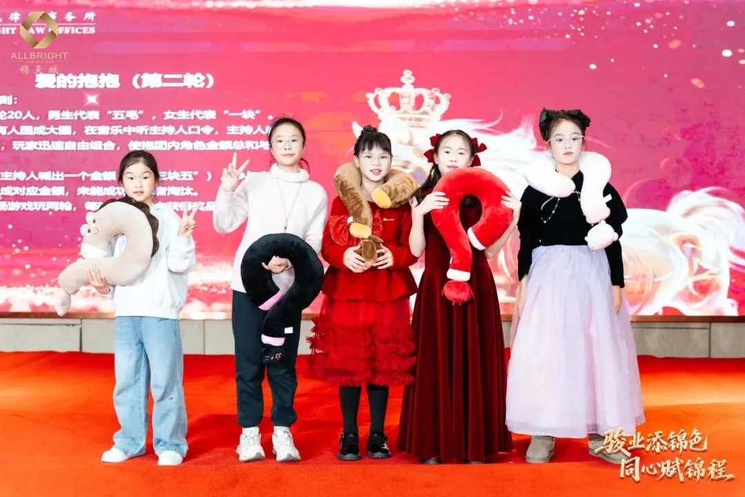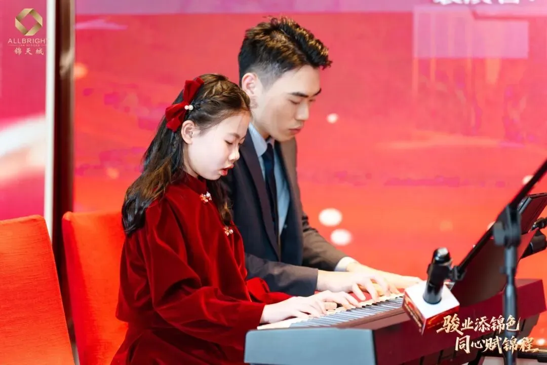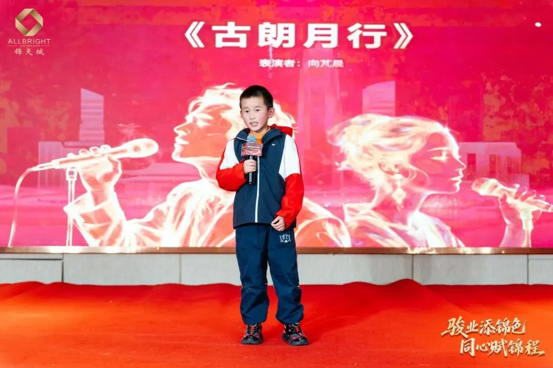 晚会进入了最富节奏感与悬念感的环节——节目演绎与抽奖环节相衔而呈,高潮迭起。刘珈亦律师与锦二代共奏钢琴曲《春节序曲》,乐韵欢腾,年意缭绕;继而独奏《人生的旋转木马》,琴音婉转,寄梦悠长。锦二代向祉凝古筝独奏《就是哪吒》激越铿锵,锦二代向芃晨童声朗诵《古朗月行》清澈动人,更有锦二代集体献诵《法韵童心 锦程同行》,温情脉脉,文脉绵延。高级合伙人杨凡律师团队与高级合伙人欧阳丽律师团队联袂合唱《我爱》,声动心弦,暖意奔涌。其间数轮抽奖惊喜频传,喝彩不绝,满堂欢腾。