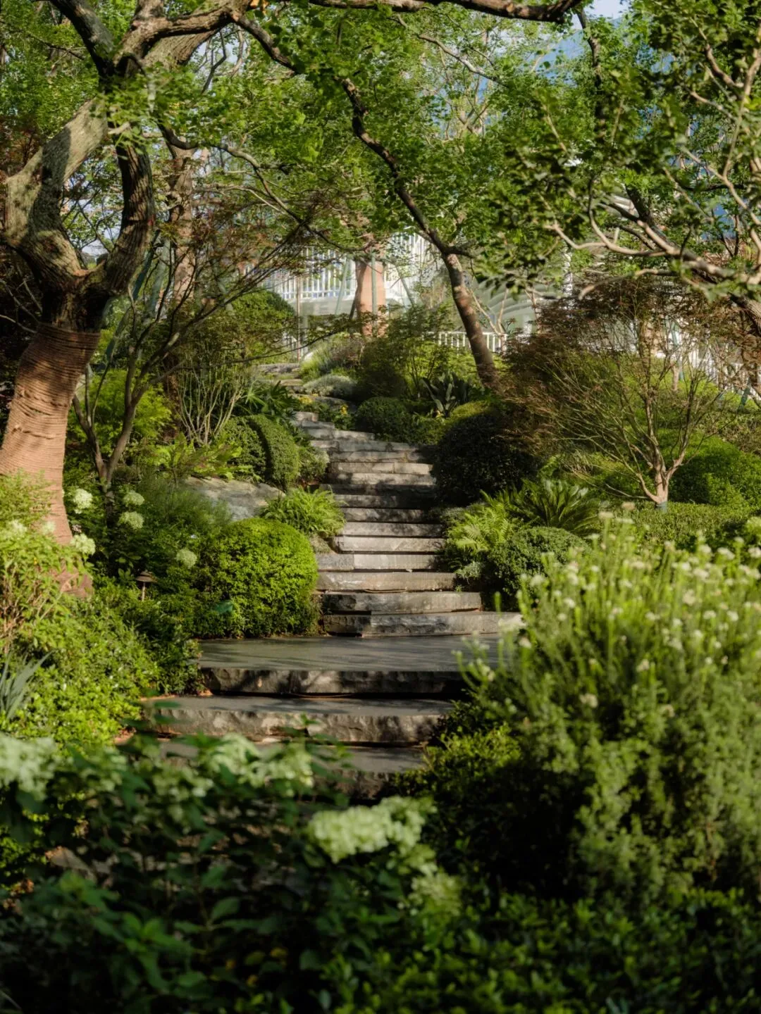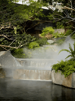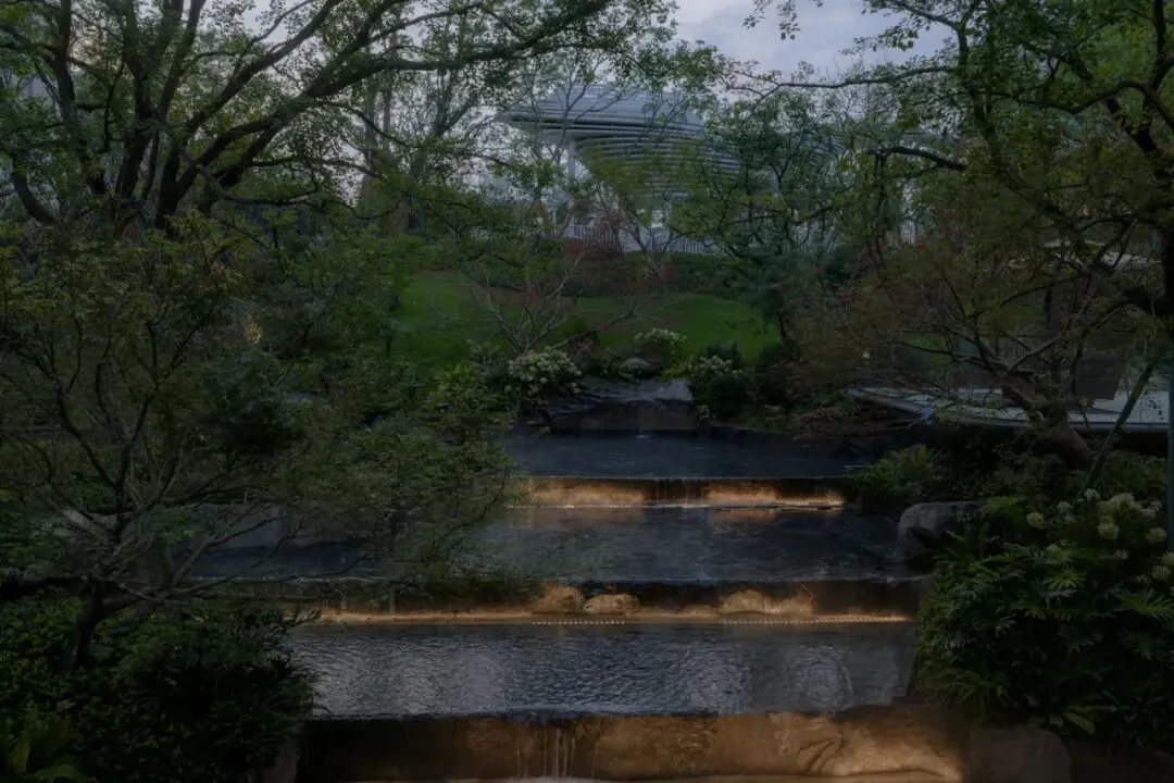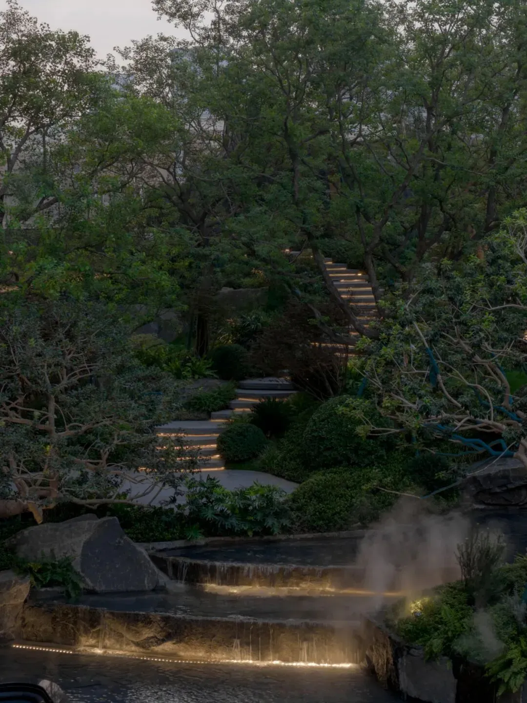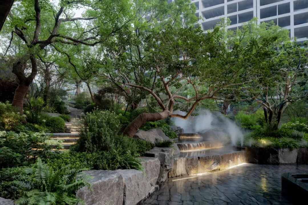 山林坡地给予场地独有的基因,而微设计是对自然的尊重。下沉会所顺应原生地形,构建超3000㎡的立体山水剧场,层级跌水与坡地山林相呼应,朴树沿坡排列,水声盈盈回荡。