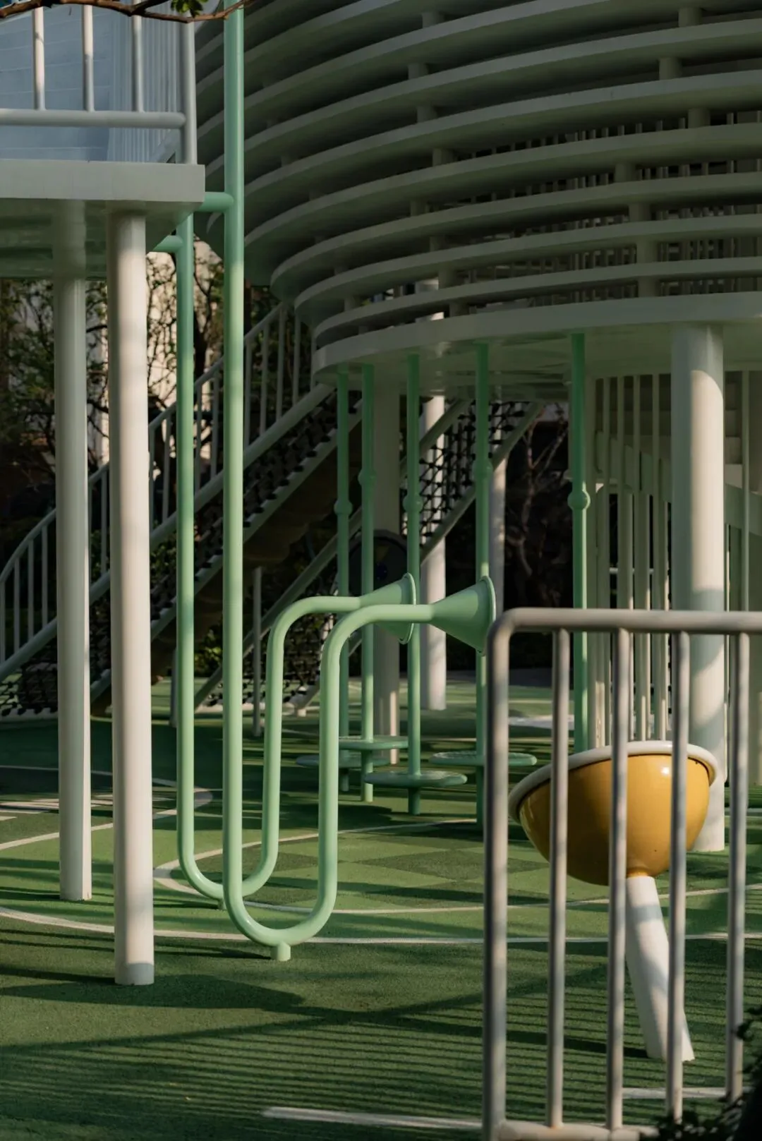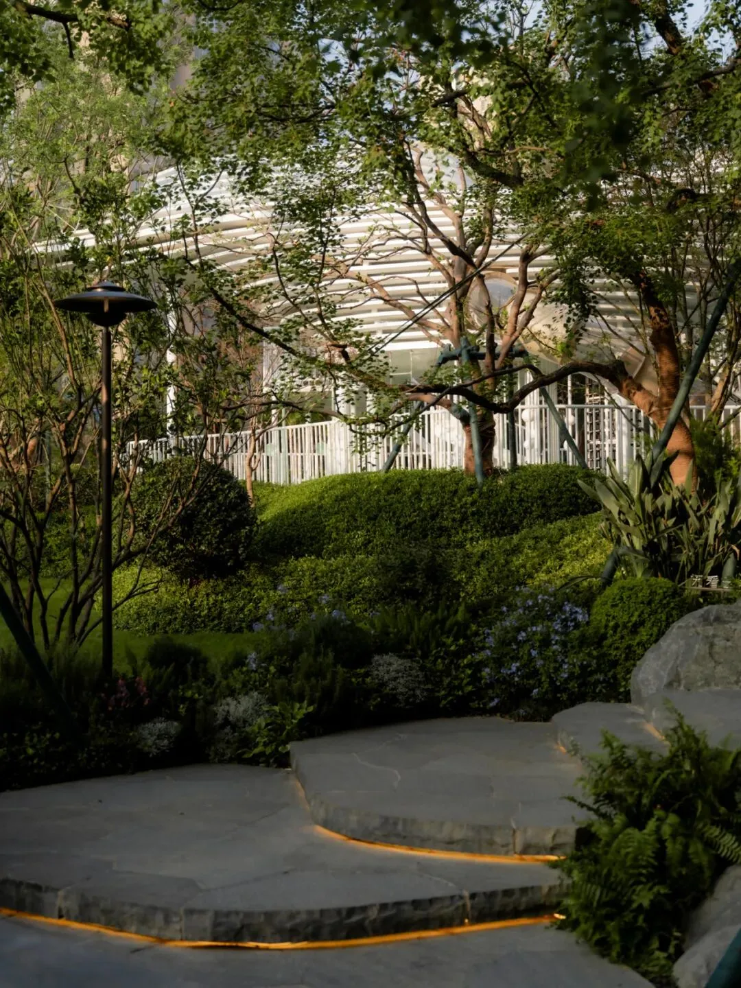 香槟色金属廊架与绿岛背景如画卷铺展,下沉会客座椅错落布置,材质柔软、触感自然,为居民提供漫步、休憩、观景的多功能空间。