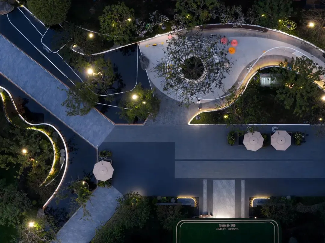 宅间花园将长沙地形与湘江水脉解构,山化为层级水景与树池,江化为蜿蜒水景线,沿路径铺陈层峦叠翠。足不出户,即可感受湘江两岸的山水意象。