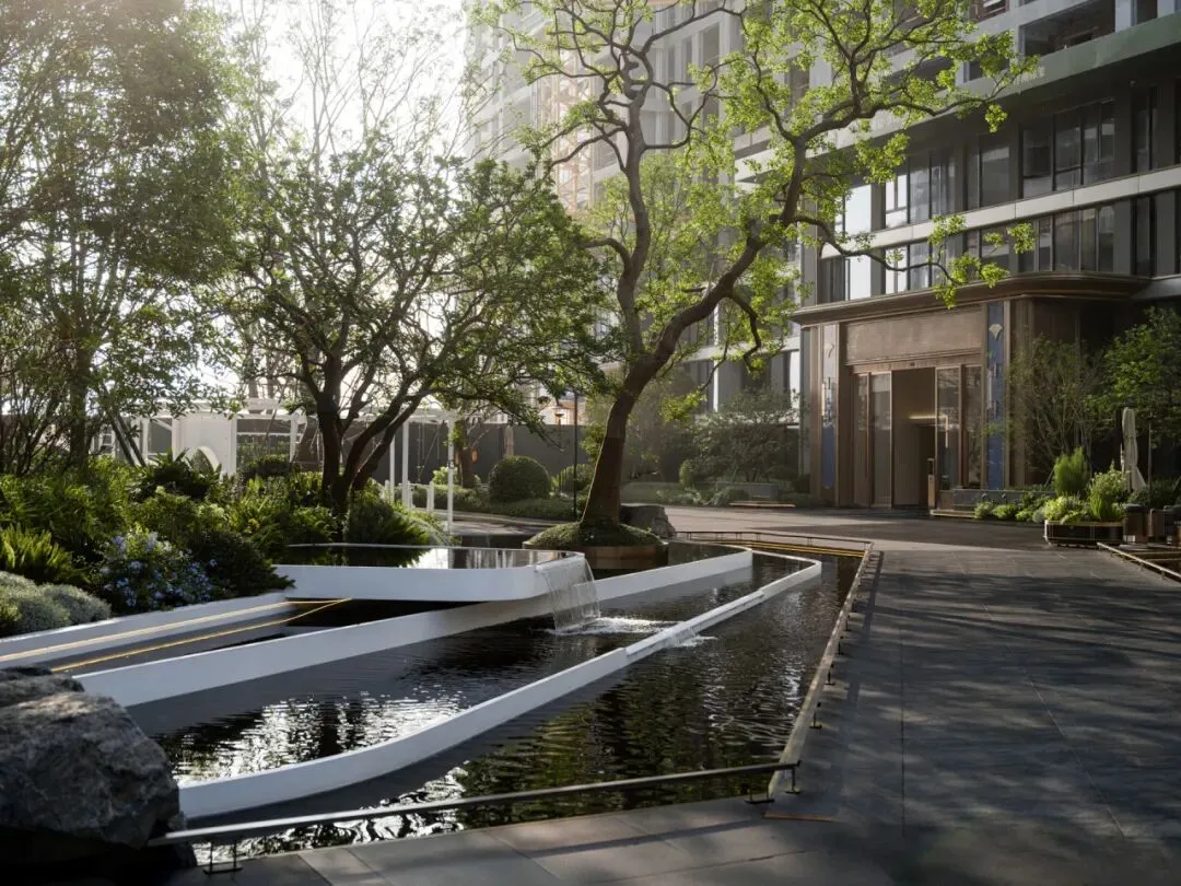 现代简约的线性几何构建叠水跌落的序列,植物精选四季常绿与花期交替组合,色彩与质感丰富而自然。艺术性的地形起伏与花镜设计,使人与土地的对话成为可能;乔木、灌木、草本立体组合,构建天然氧吧,使社区不仅可居,更可呼吸。